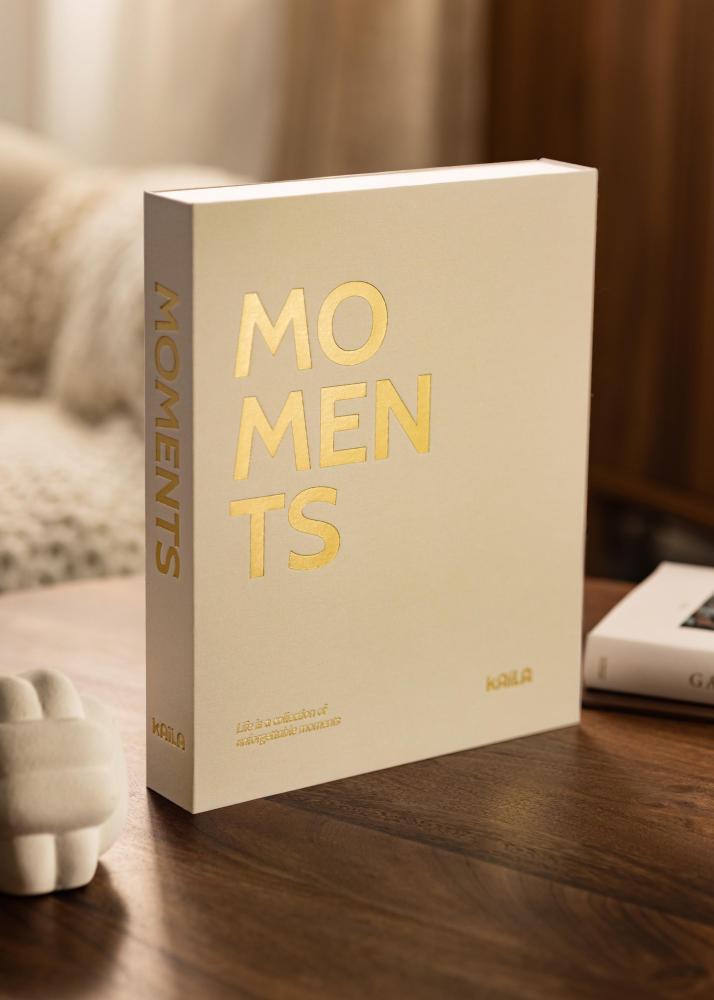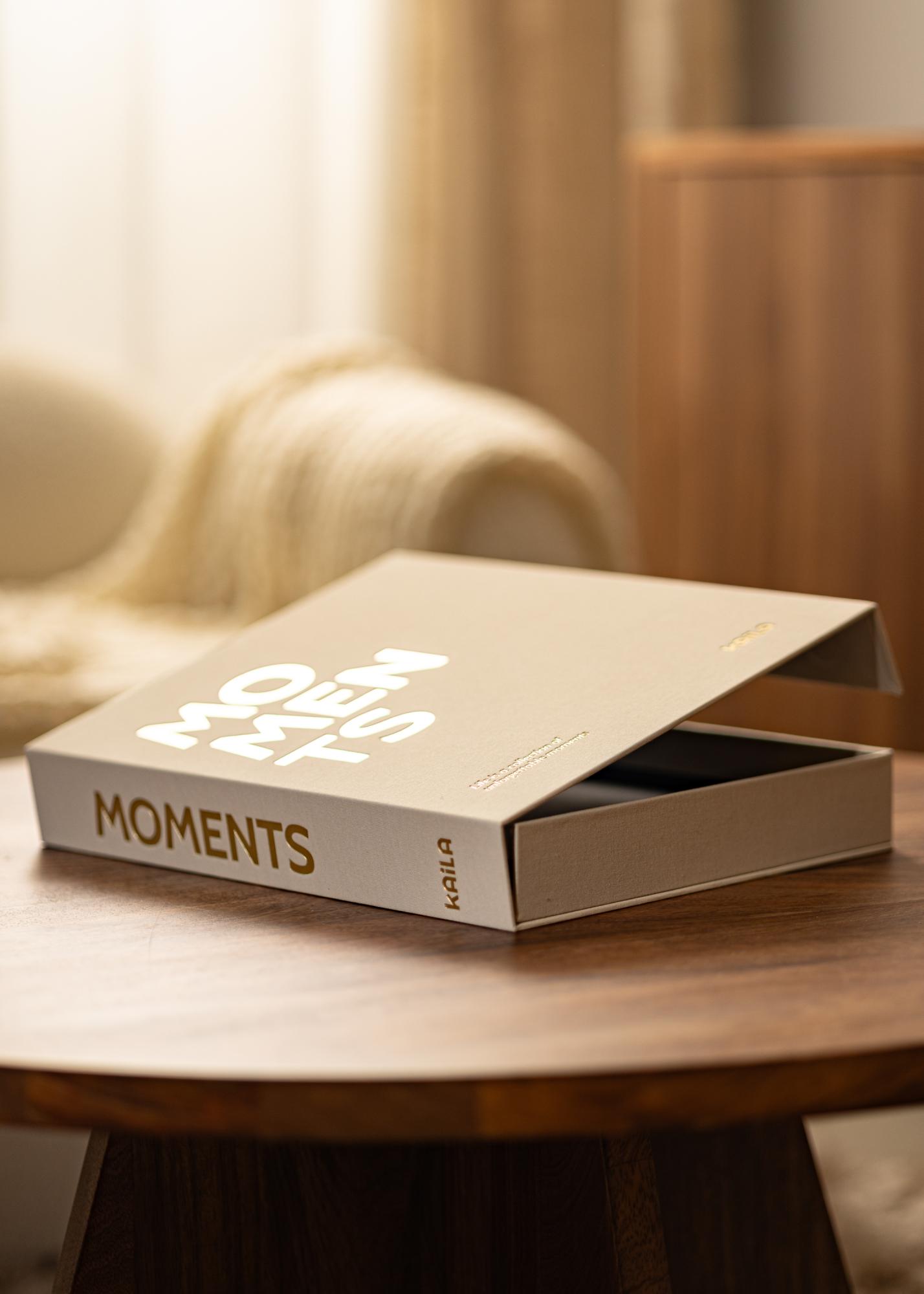 O álbum de fotos é desenhado como uma caixa que pode abrir para acessar suas imagens. A capa é decorada com tecido de cor creme, o que proporciona uma sensação de luxo. Na frente e na lateral, está escrito "MOMENTS". No canto superior esquerdo da parte superior, pode ver o belo subtítulo "A vida é uma coleção de momentos inesquecíveis".