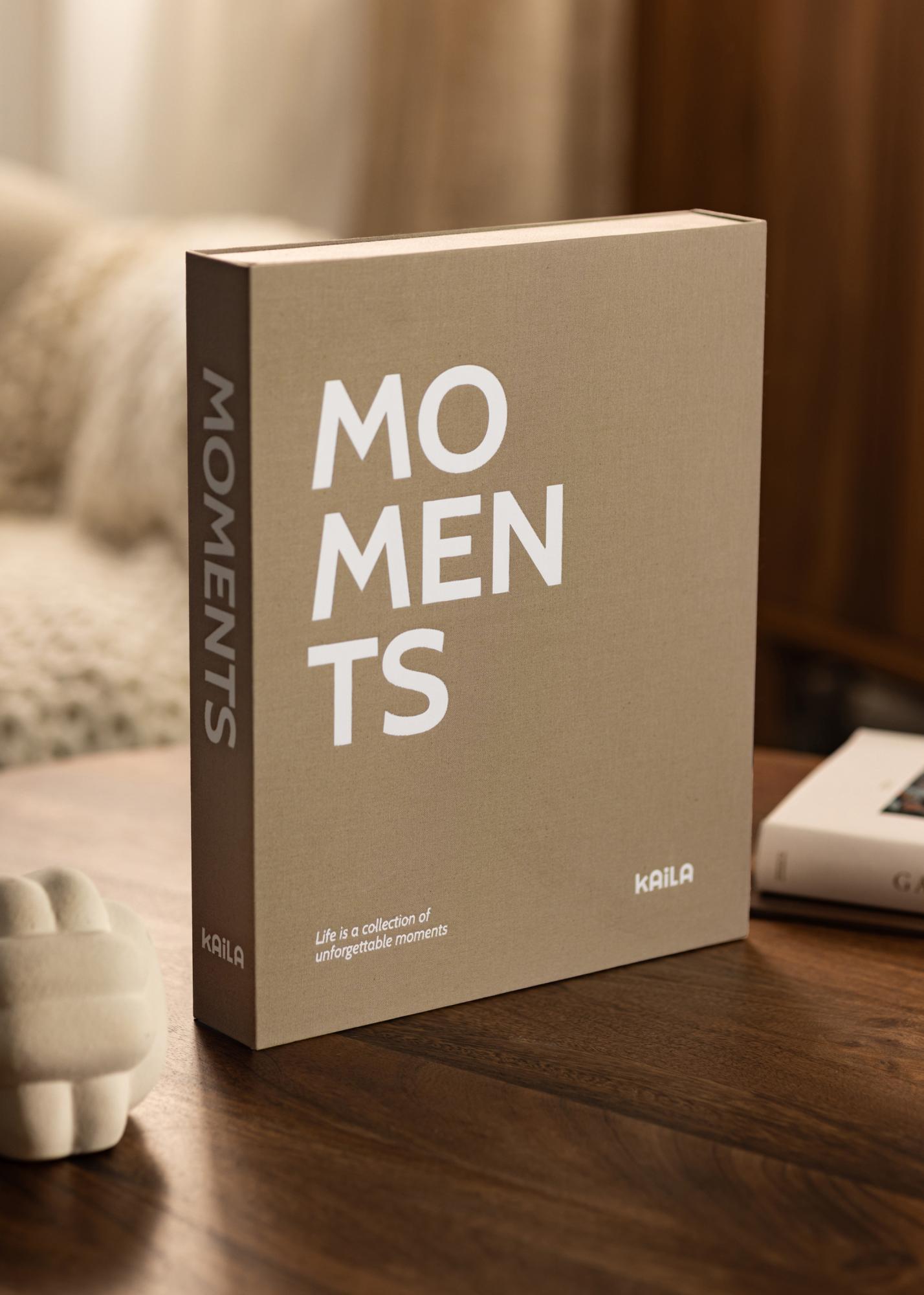 O álbum de fotos é desenhado como uma caixa que pode abrir para acessar suas imagens. A capa é decorada com tecido cinzento, o que proporciona uma sensação de luxo. Na frente e na lateral, está escrito "MOMENTS". No canto superior esquerdo da parte superior, pode ver o belo subtítulo "A vida é uma coleção de momentos inesquecíveis".