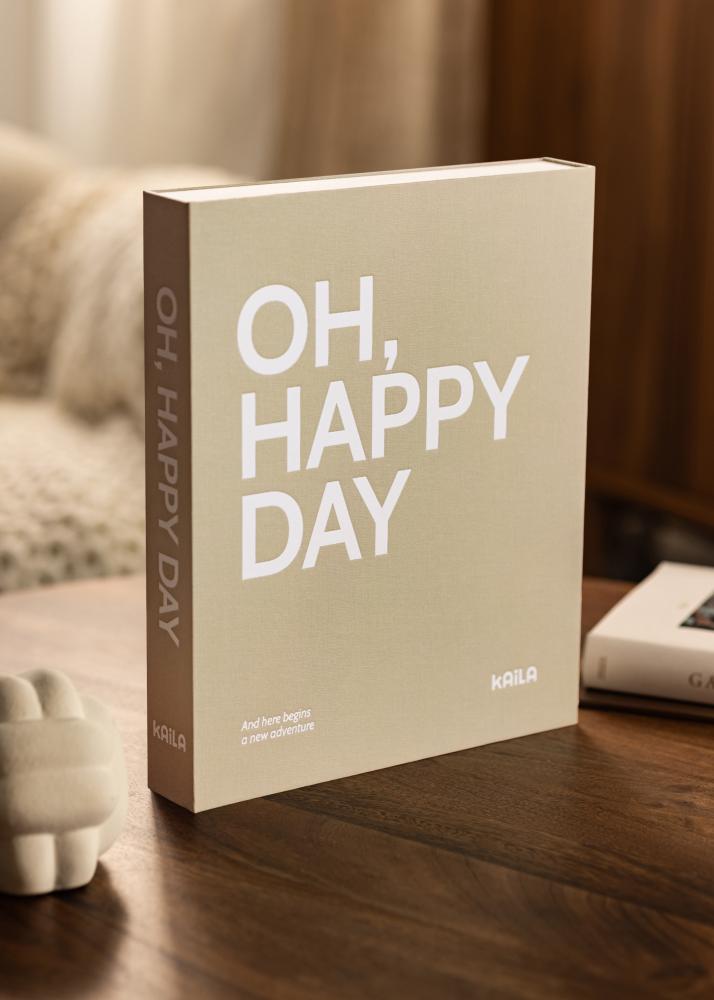 Aqui está um álbum de fotos perfeito para as suas memórias mais felizes do KAILA! Guarde-as com estilo em um álbum de fotos de mesa de café leve em tecido, que também se torna um elegante detalhe de decoração em sua casa. Este álbum tem o título "OH, HAPPY DAY" impresso na capa em letras grandes e brancas, e o subtítulo "E aqui começa uma nova aventura".