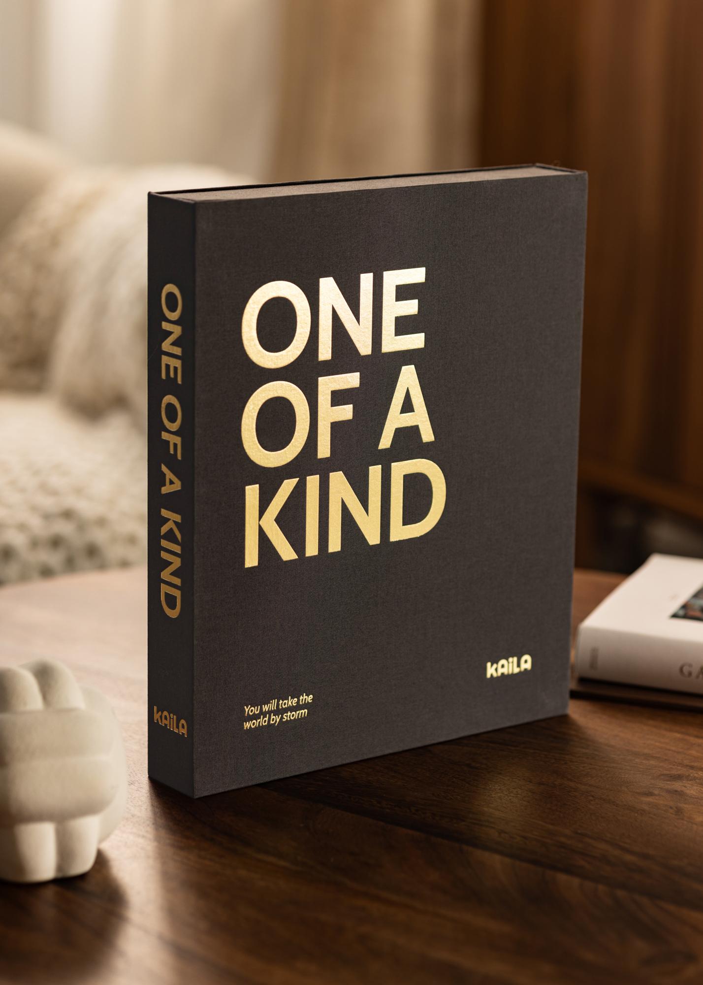 Imprima suas fotos e guarde-as em um belo álbum de fotos de mesa de café! Este álbum de fotos da KAILA é revestido em tecido preto e tem o formato de uma caixa de luxo, o que realmente confere-lhe uma sensação exclusiva. O melhor é que este álbum de fotos é tão bonito quanto um objeto de decoração! Na capa do álbum de fotos, o título "ONE OF A KIND" está impresso em letras brancas grandes e a legenda "You will take the world by storm", o que torna este álbum perfeito para fotos bonitas da infância ou para presentear alguém especial, ou é claro, para as suas próprias memórias fotográficas maravilhosas.