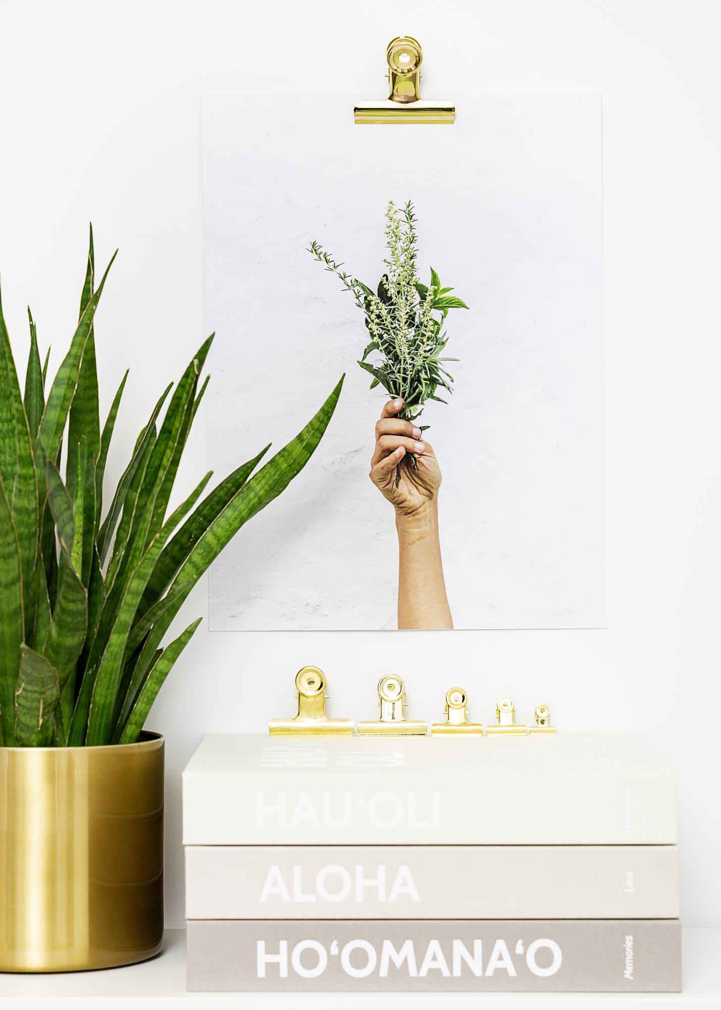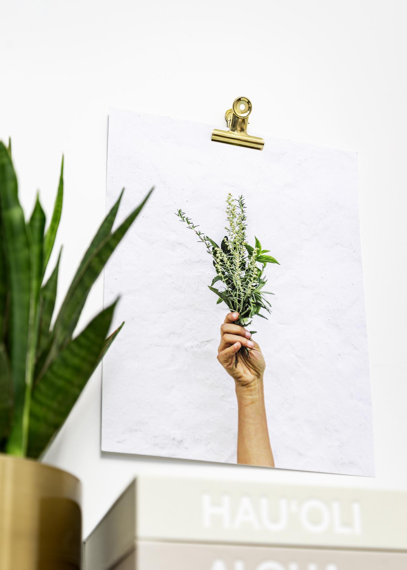 Um grampo de metal com um acabamento elegante e brilhante em dourado que dá aos seus pósteres e impressões uma suspensão moderna e minimalista. O design do grampo do póster é elegante e os furos na parte superior redonda do grampo facilitam a fixação na parede com um pequeno prego ou parafuso. A abertura do grampo tem uma aderência adequada que permite pendurar o papel mais fino, ao mesmo tempo em que é flexível e permite a montagem de imagens com diferentes espessuras. Se tem um póster grande para pendurar, use dois grampos de metal para obter os melhores resultados.