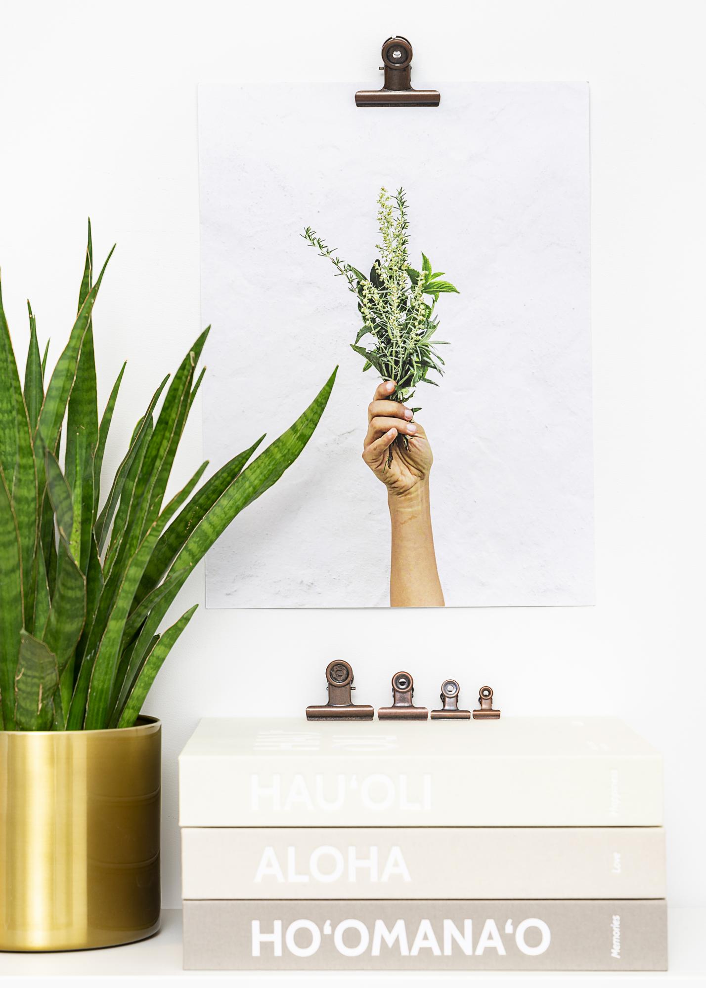 Este é um grampo de metal no estilo rústico com um belo latão gasto que proporciona uma suspensão elegante de pósteres ou impressões. A montagem na parede também é muito simples graças aos furos na parte superior redonda do grampo de póster. A abertura do grampo oferece uma aderência flexível, mas forte, que permite que pendure tanto papéis finos quanto pósteres com uma espessura um pouco mais generosa, e se quiser pendurar um póster grande, sempre pode optar por usar dois grampos de metal.