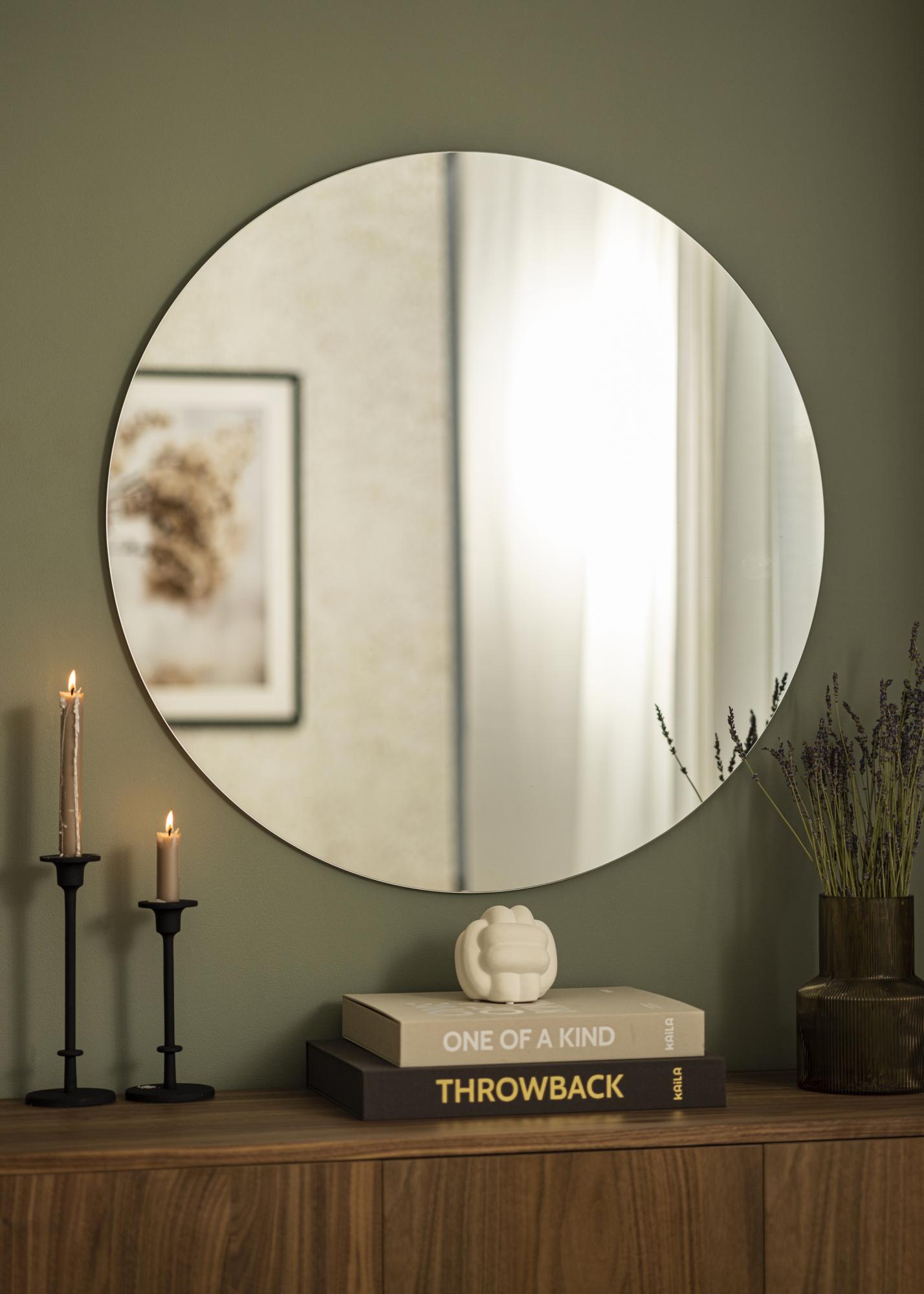 Espelho redondo de 80 cm de diâmetro que faz parte de uma série de espelhos redondos da KAILA. Disponível em 13 tamanhos diferentes para que encontre o tamanho perfeito para o seu quarto. O espelho é extremamente fino e elegante, adequado para todos os tipos de ambientes e estilos de decoração.