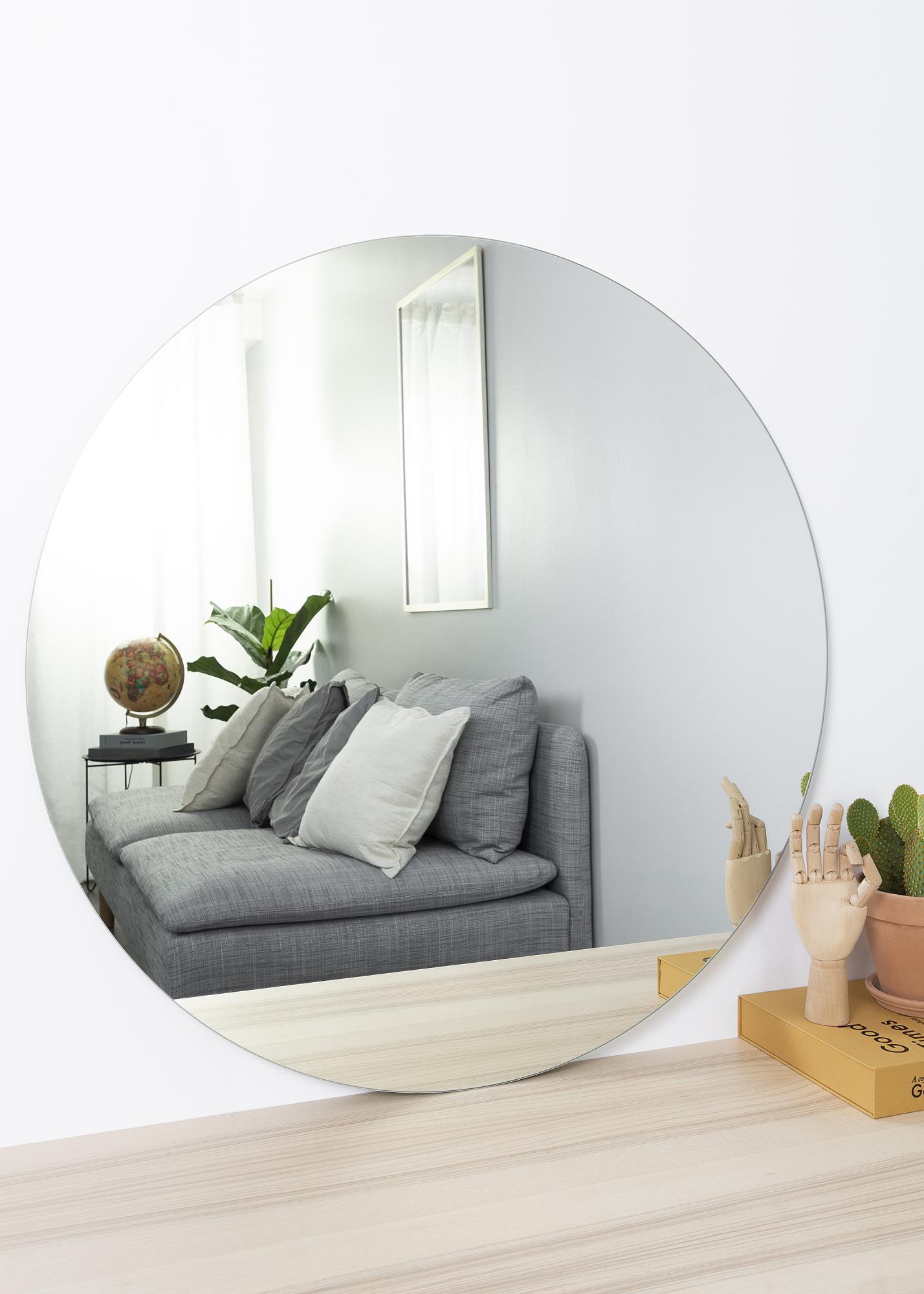 Espelho redondo de 90 cm de diâmetro que faz parte de uma série de espelhos redondos da KAILA. Disponível em 13 tamanhos diferentes para que encontre o tamanho perfeito para o seu quarto. O espelho é extremamente fino e elegante, adequado para todos os tipos de ambientes e estilos de decoração.