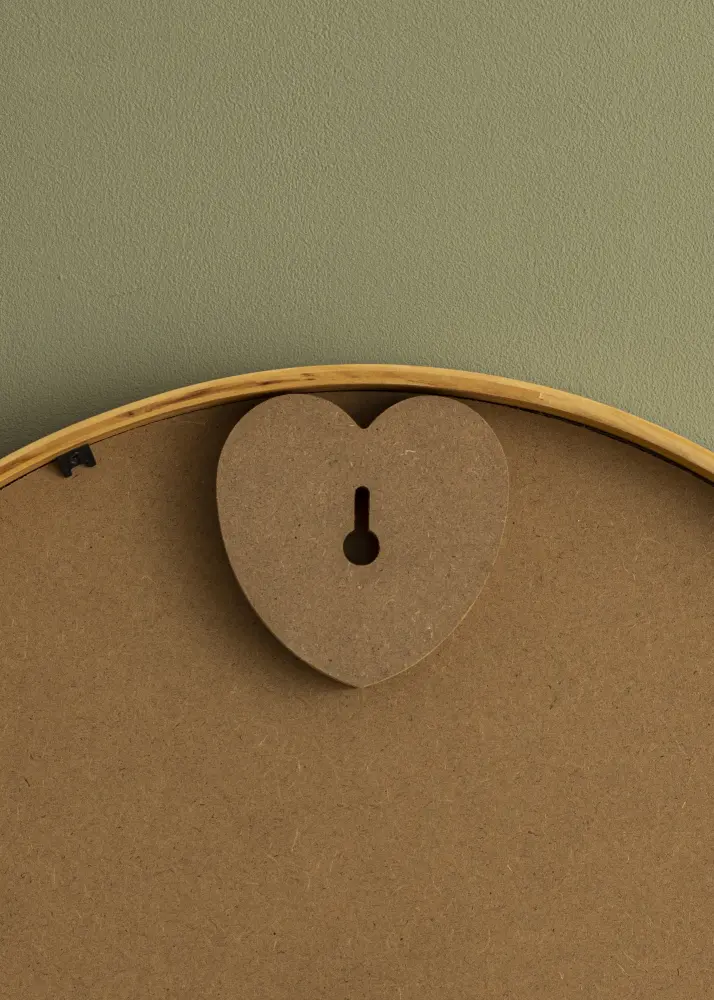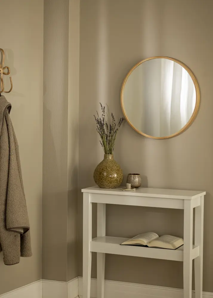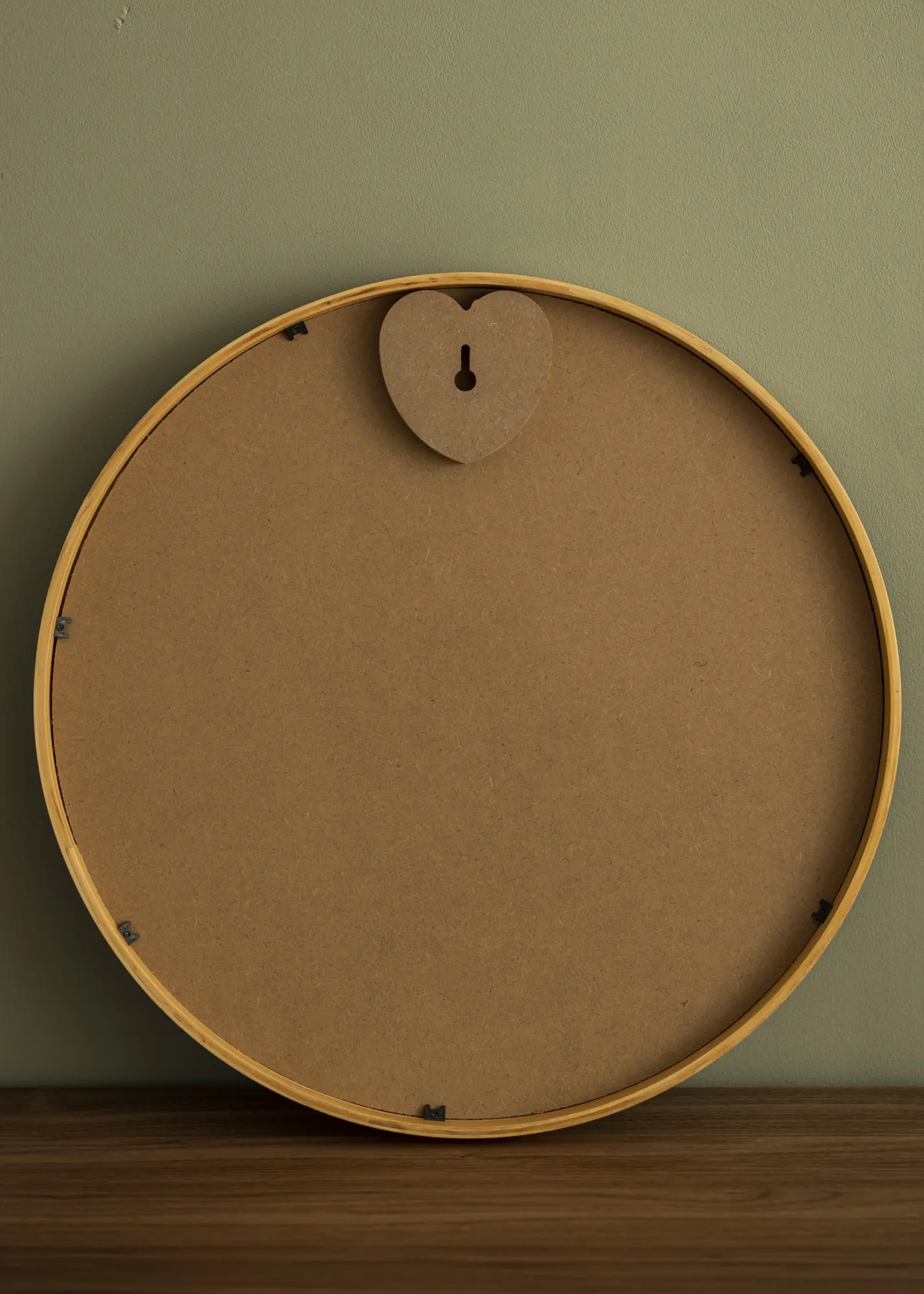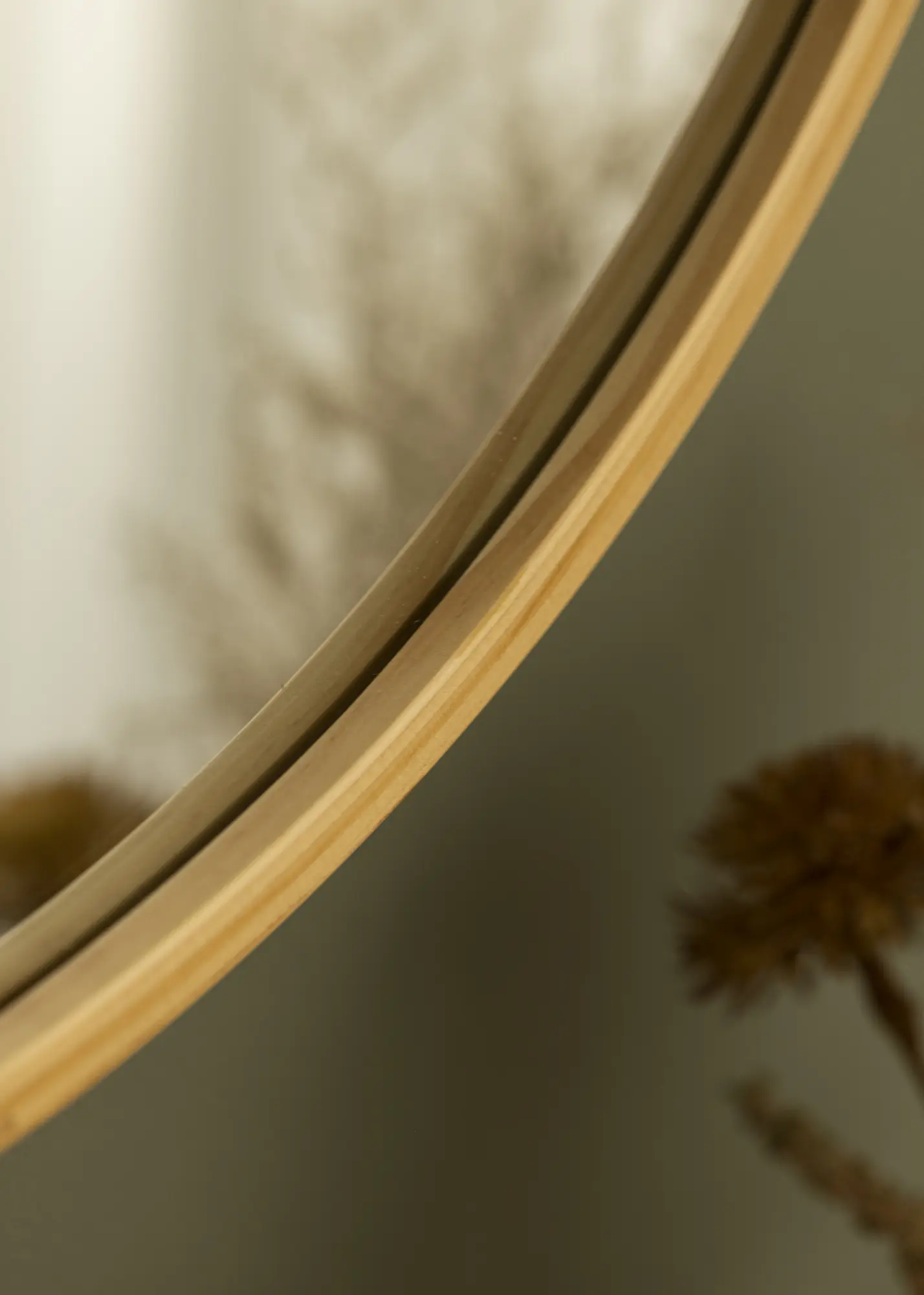 Este é um espelho redondo com uma borda em madeira clara. Este espelho de parede é especialmente adequado para aqueles que são atraídos por um estilo de decoração terroso e moderno. Detalhes de decoração com design natural, como este espelho, contribuem para uma atmosfera acolhedora e aconchegante em sua casa. Suporte de parede disponível. O espelho tem 50 cm de diâmetro.