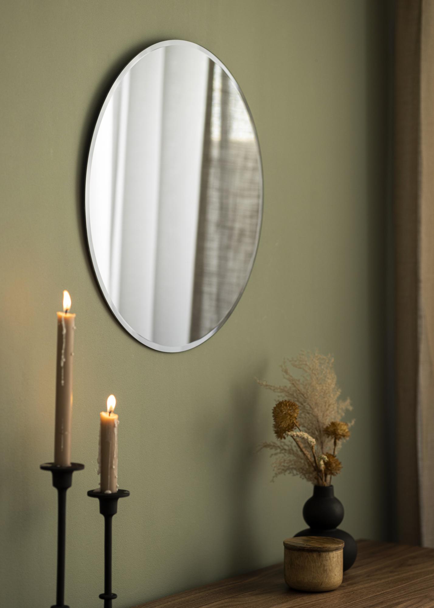 A sensação elegante transmitida pela forma e cor do espelho é reforçada pelo facto de que o espelho não possui uma moldura. Em vez disso, as bordas são adornadas com uma borda facetada elegante, que dá ao espelho um toque especial.