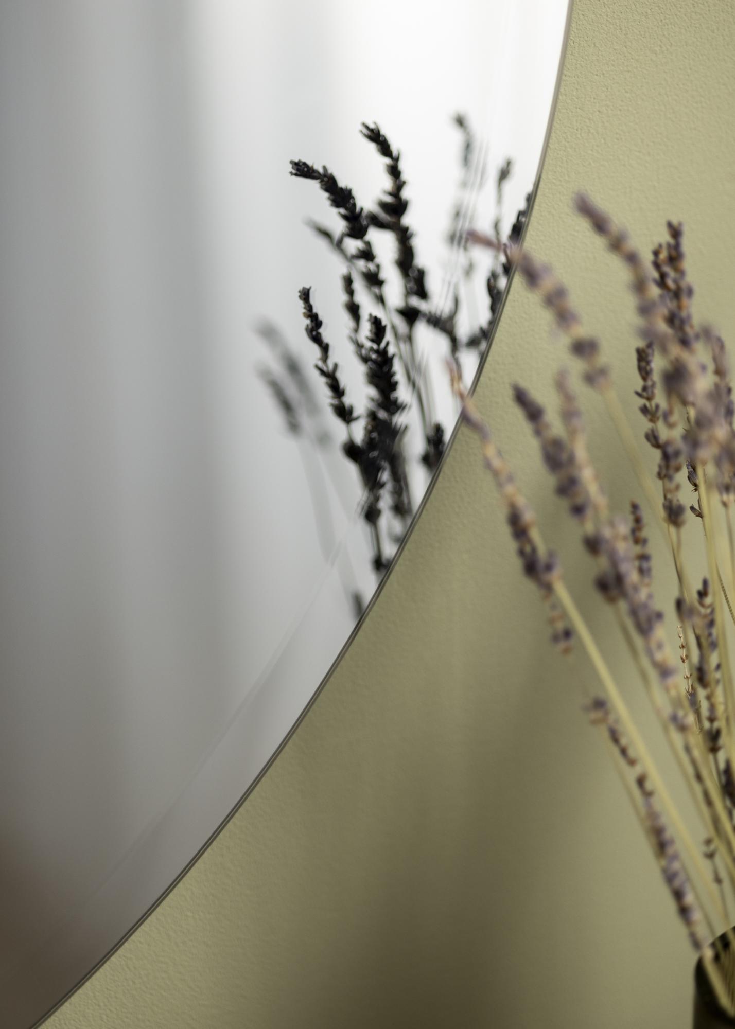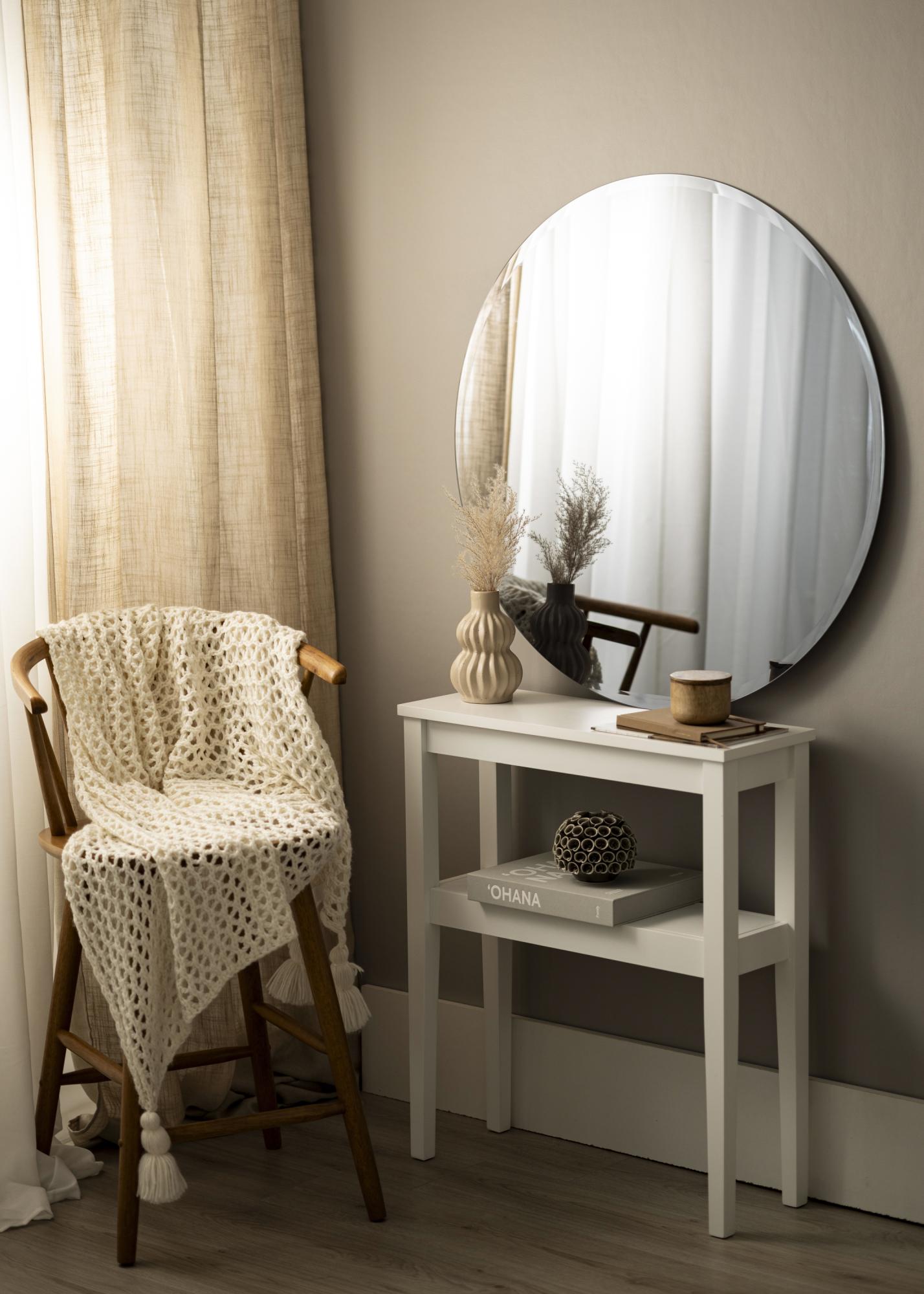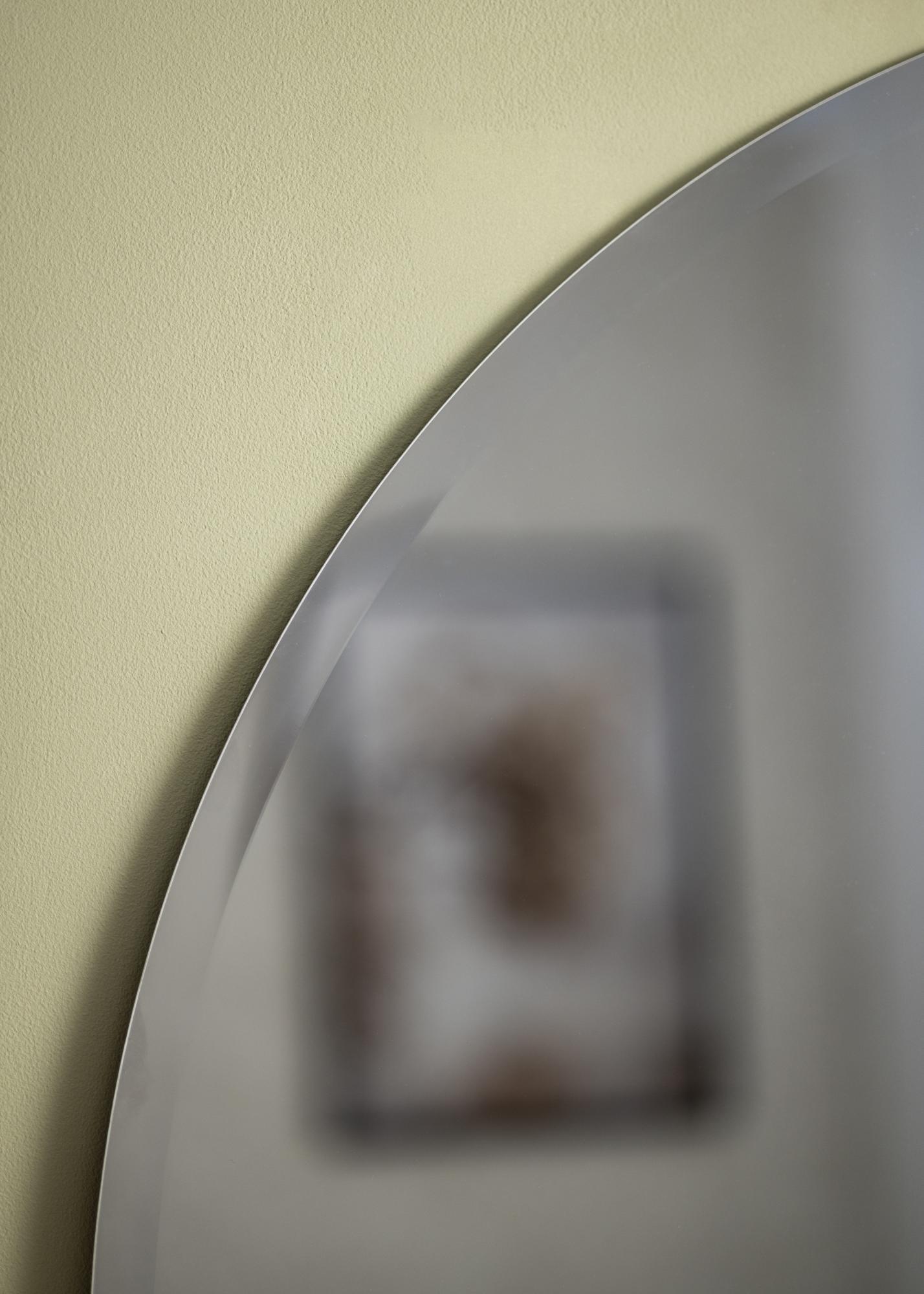 A sensação elegante transmitida pela forma e cor do espelho é reforçada pelo facto de que o espelho não possui uma moldura. Em vez disso, as bordas são adornadas com uma borda facetada elegante, que dá ao espelho um toque especial.