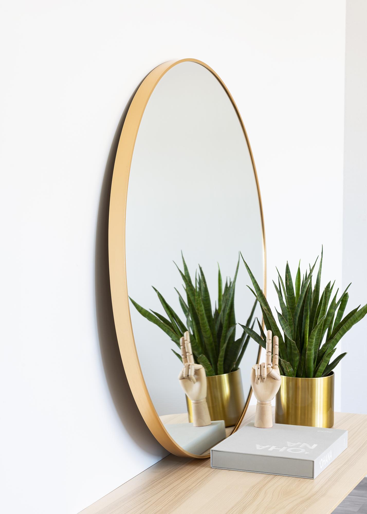 Um espelho redondo num design sueco elegante, com uma moldura de metal em um belo acabamento dourado. A moldura tem uma superfície escovada, o que dá à bela cor dourada um aspecto um pouco mais mate. A moldura também é fina e moderna, mas ao mesmo tempo - dependendo do tamanho - tem uma profundidade entre 30-40 mm, o que faz com que ela se projete um pouco da parede e crie um efeito 3D impressionante. A profundidade da moldura também faz com que o espelho pareça sólido e robusto, sem tirar a sensação minimalista do espelho.