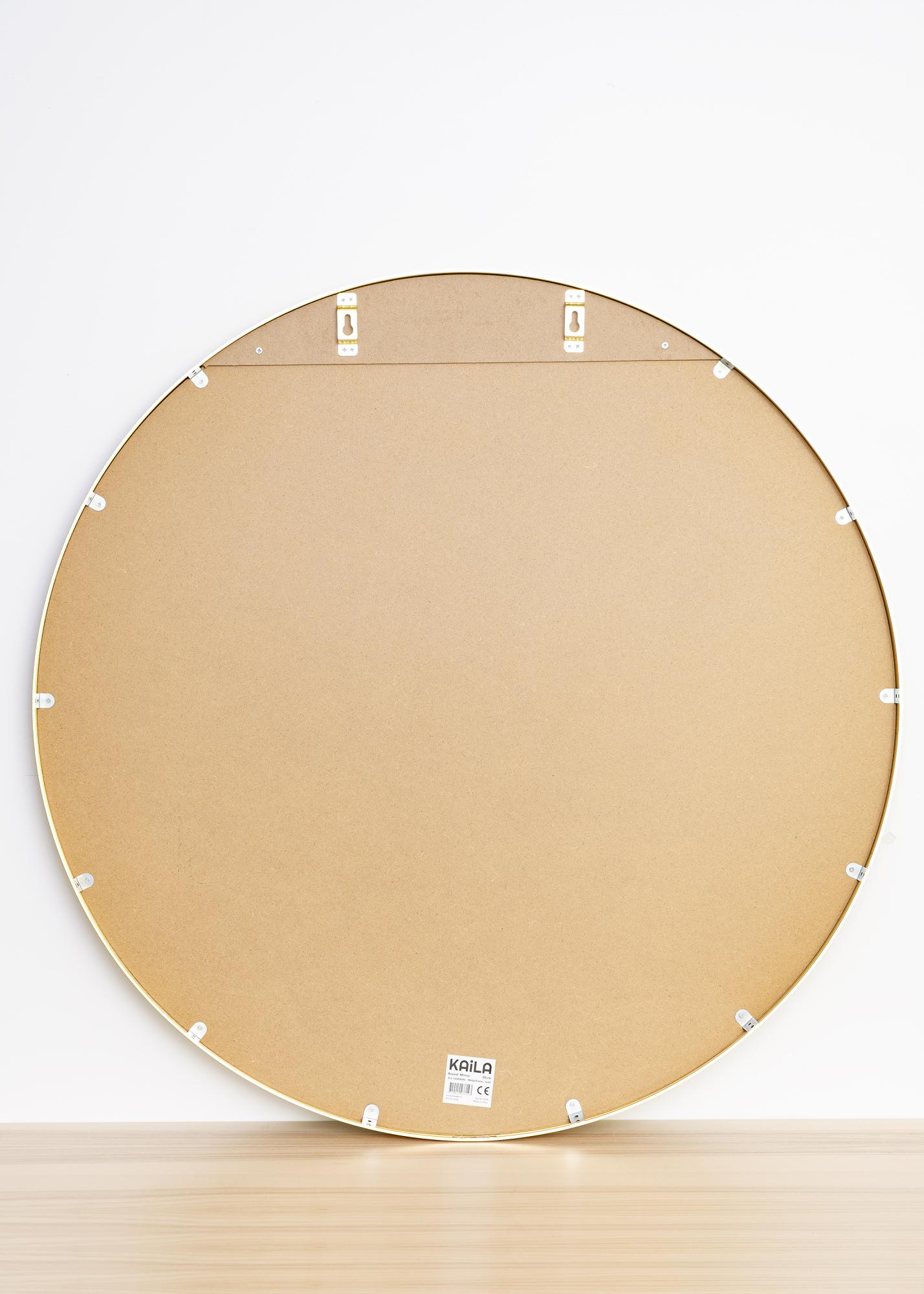 O espelho redondo KAILA Edge Gold está disponível em vários tamanhos diferentes, e este espelho tem um diâmetro de 100 cm. A parte de trás do espelho possui duas fixações de parede para uma instalação fácil e estável na parede, e parafusos e buchas adequados estão incluídos.