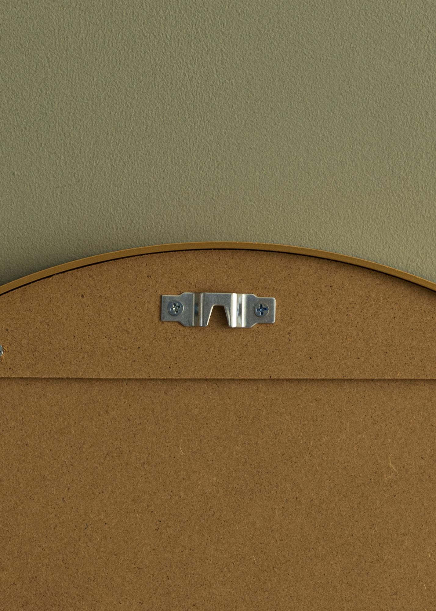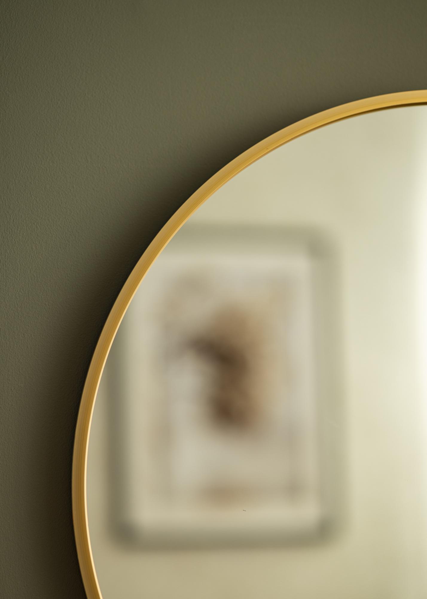 Um espelho redondo num design sueco elegante, com uma moldura de metal em um belo acabamento dourado. A moldura tem uma superfície escovada, o que dá à bela cor dourada um aspecto um pouco mais mate. A moldura também é fina e moderna, mas ao mesmo tempo - dependendo do tamanho - tem uma profundidade entre 30-40 mm, o que faz com que ela se projete um pouco da parede e crie um efeito 3D impressionante. A profundidade da moldura também faz com que o espelho pareça sólido e robusto, sem tirar a sensação minimalista do espelho.