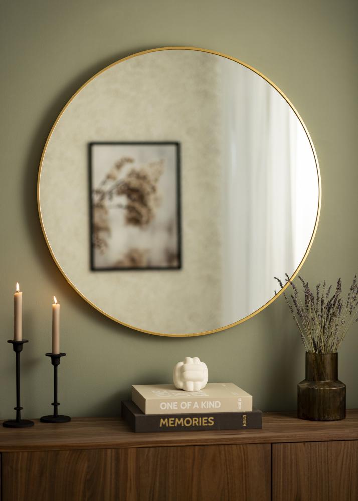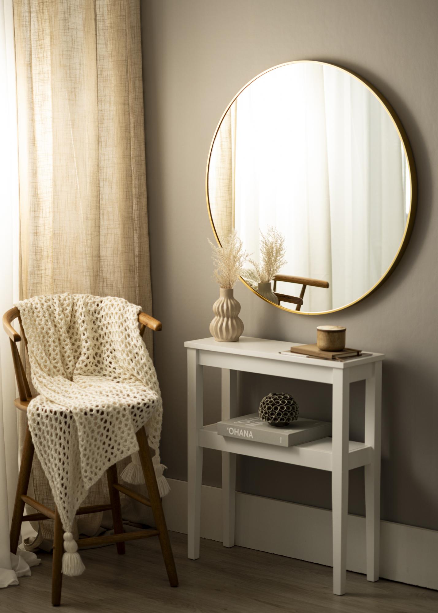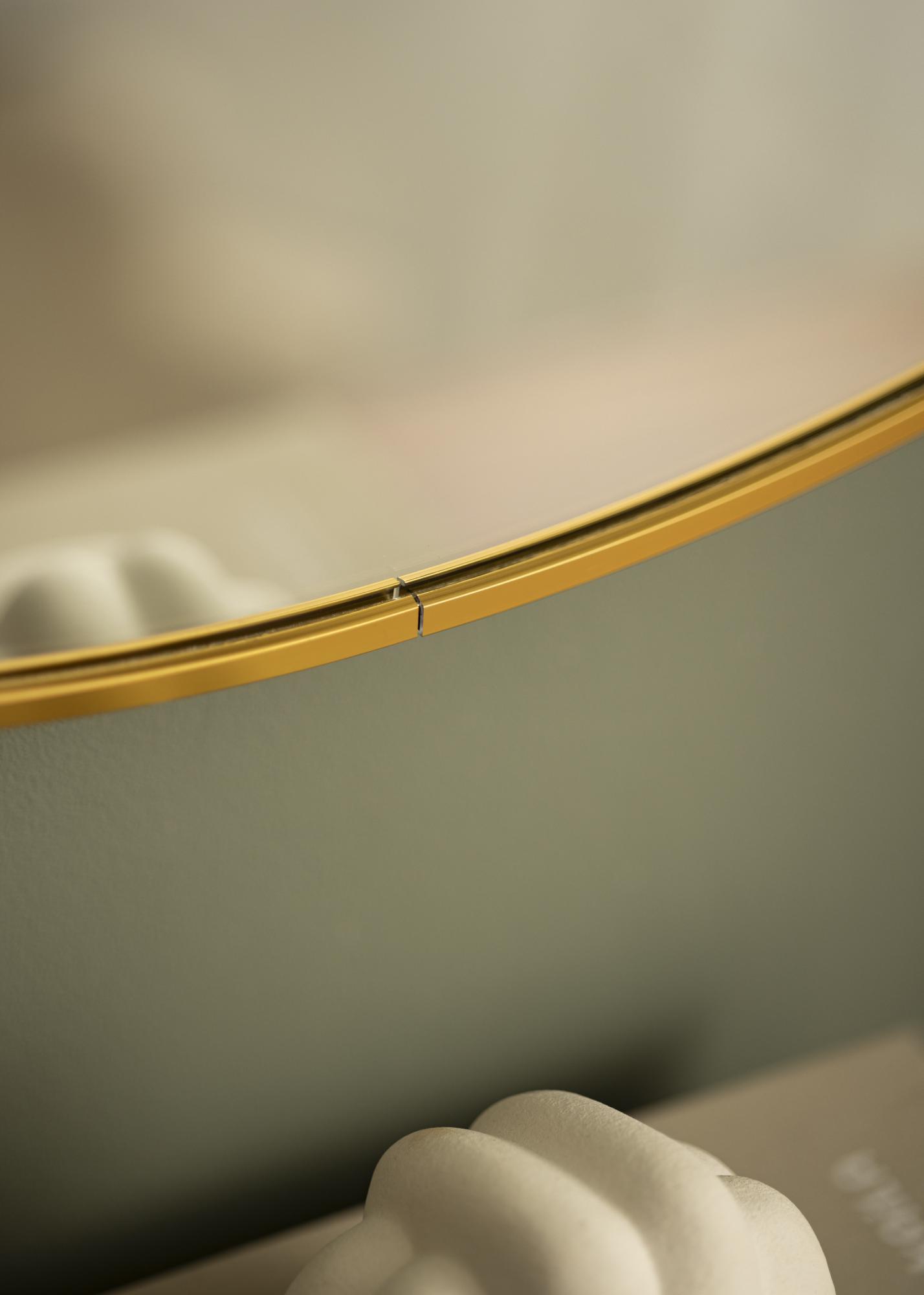 Um espelho redondo num design sueco elegante, com uma moldura de metal em um belo acabamento dourado. A moldura tem uma superfície escovada, o que dá à bela cor dourada um aspecto um pouco mais mate. A moldura também é fina e moderna, mas ao mesmo tempo - dependendo do tamanho - tem uma profundidade entre 30-40 mm, o que faz com que ela se projete um pouco da parede e crie um efeito 3D impressionante. A profundidade da moldura também faz com que o espelho pareça sólido e robusto, sem tirar a sensação minimalista do espelho.