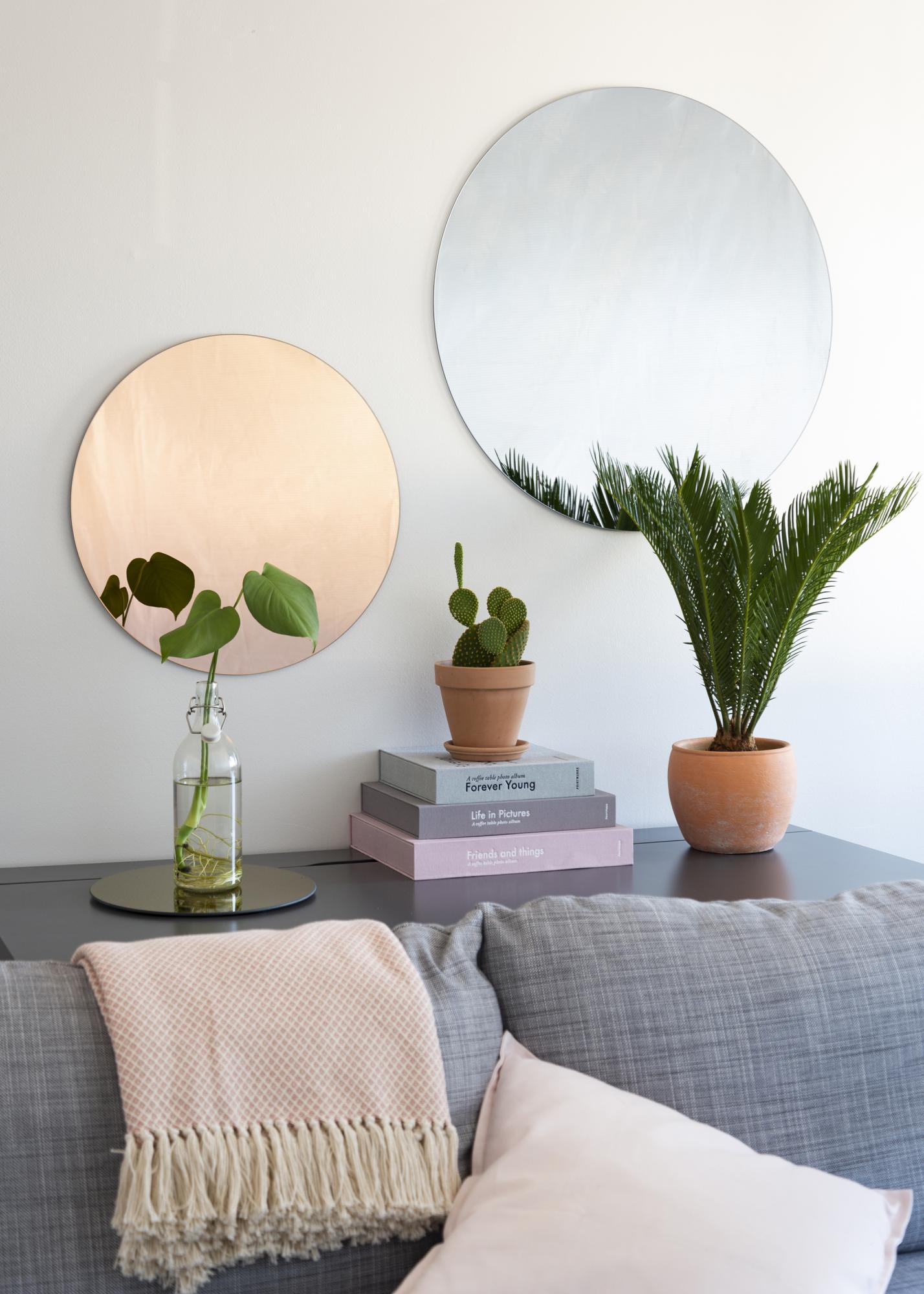 O espelho redondo KAILA Rose Gold está disponível em vários tamanhos. Este modelo tem o generoso tamanho de 110 cm Ø.