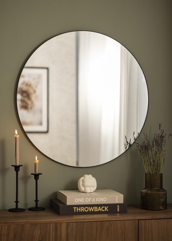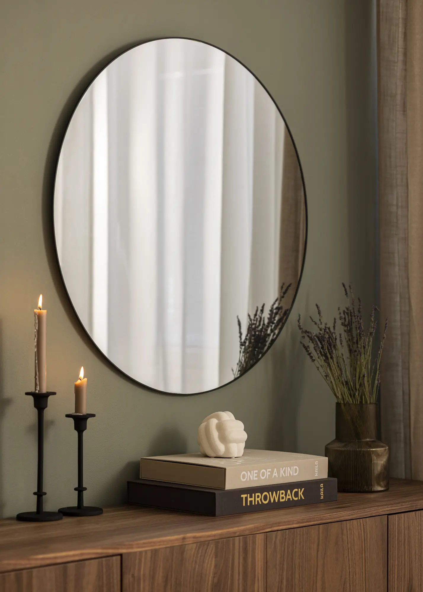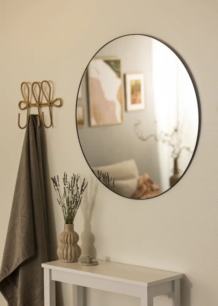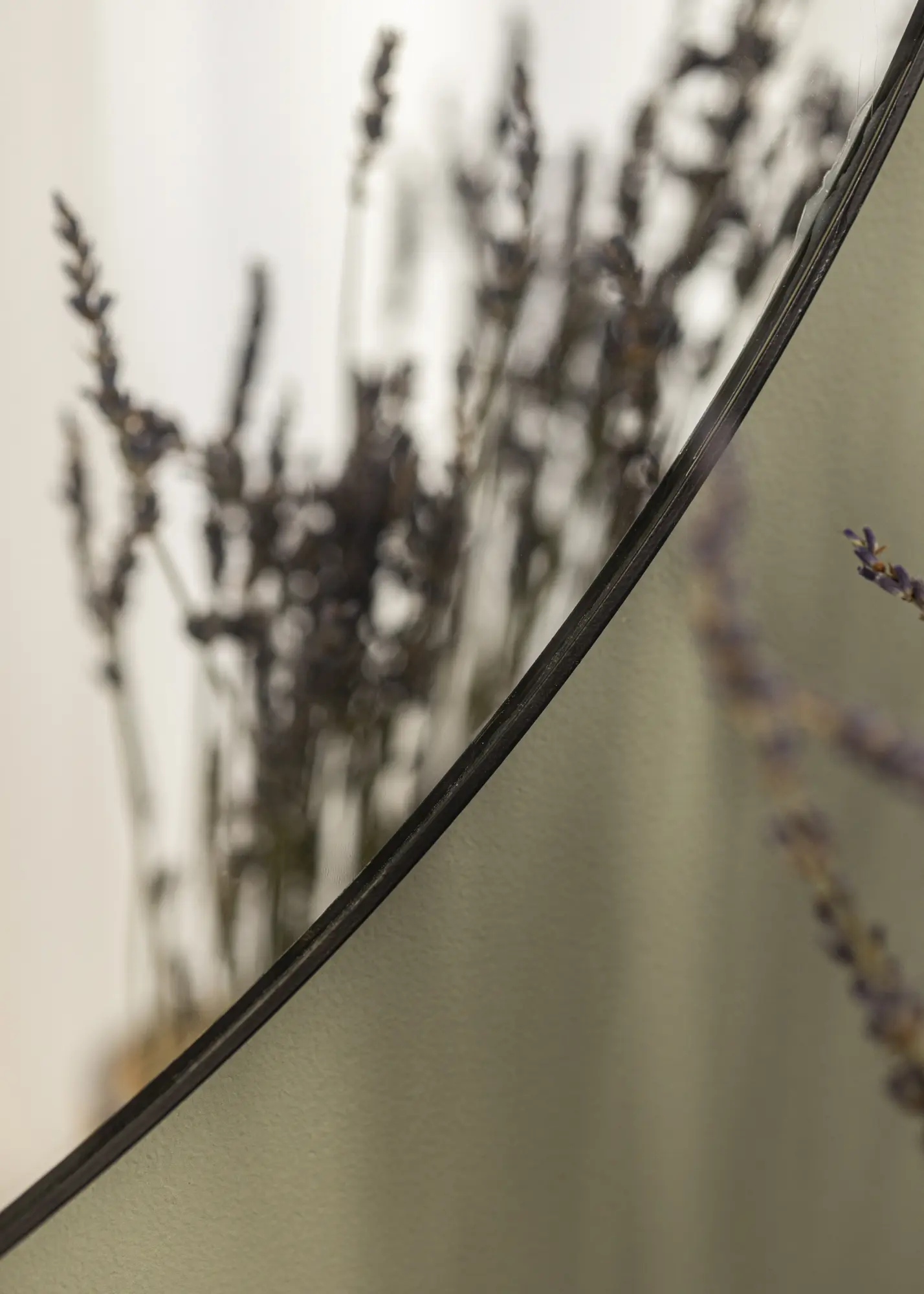 O KAILA Thin Black é um espelho redondo e elegante com uma moldura de metal fina e preta que confere ao espelho uma sensação industrial. O design minimalista do espelho faz com que ele se adapte a todas as casas e estilos de decoração - tanto clássicos como modernos. Em harmonia com outras decorações industriais, ou como um contraste elegante para uma decoração mais suave.