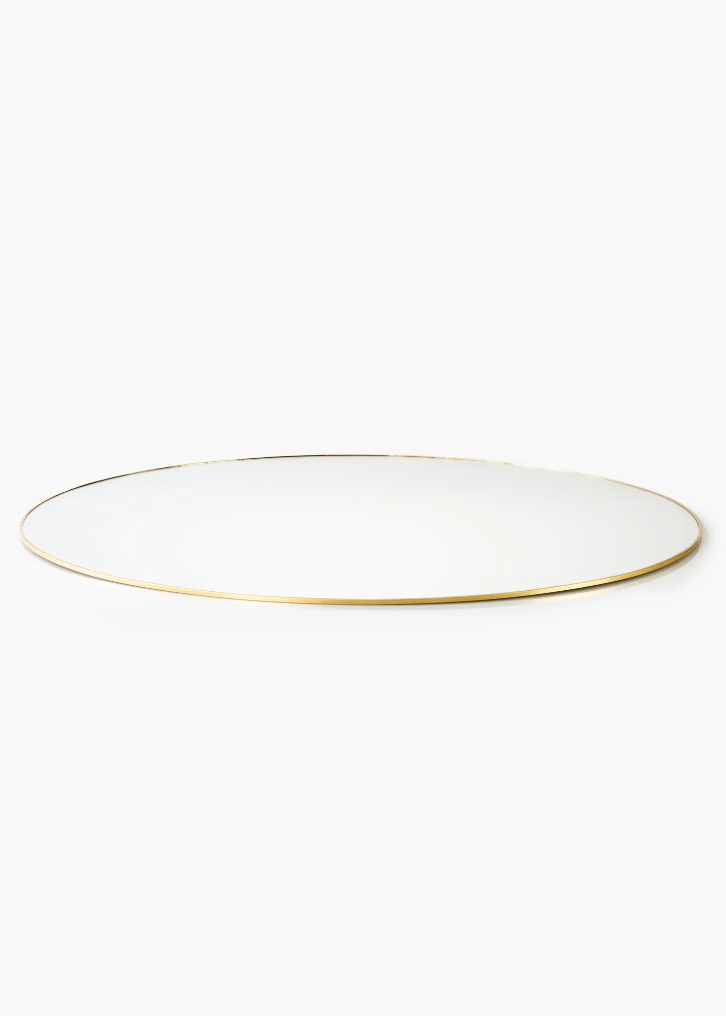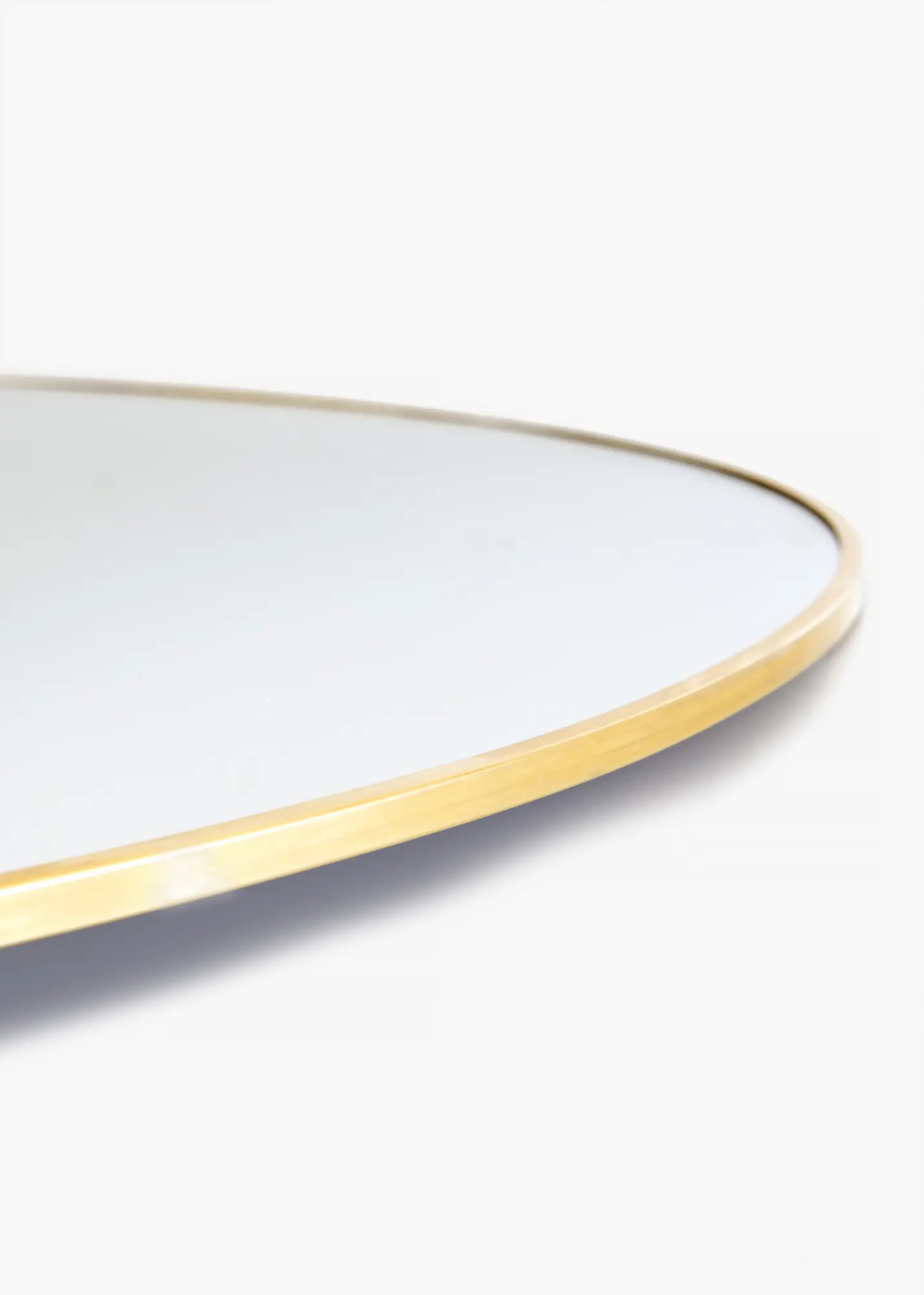 KAILA Thin Brass da marca sueca KAILA é um espelho de parede decorativo com uma moldura elegante e cor de latão. Este espelho redondo adiciona uma sensação de luxo e calor a quase qualquer sala, seja sozinho na parede ou em conjunto com outros belos detalhes de parede.