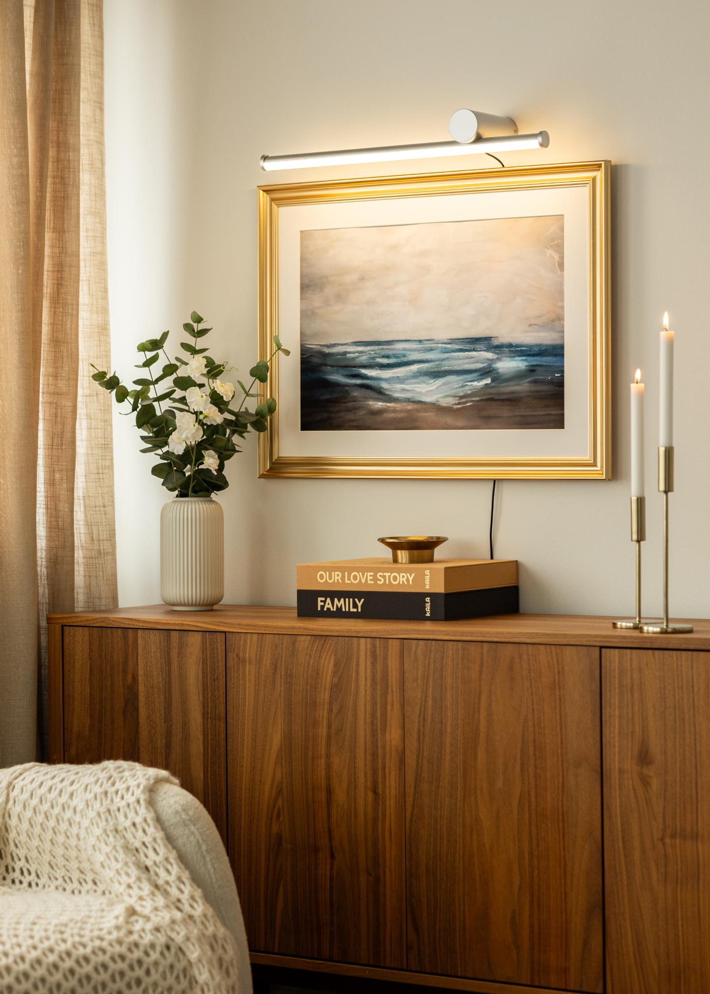 A iluminação está equipada com uma fonte de luz LED que proporciona uma luz branca quente de 3000K. Esta luz é agradável e cria uma atmosfera suave e convidativa no ambiente sem ser muito forte. A intensidade luminosa é de 780 lúmens, o que oferece luz suficiente para destacar os detalhes da sua arte sem ser avassalador. A luz é distribuída uniformemente, fazendo com que cada parte do quadro seja claramente visível.