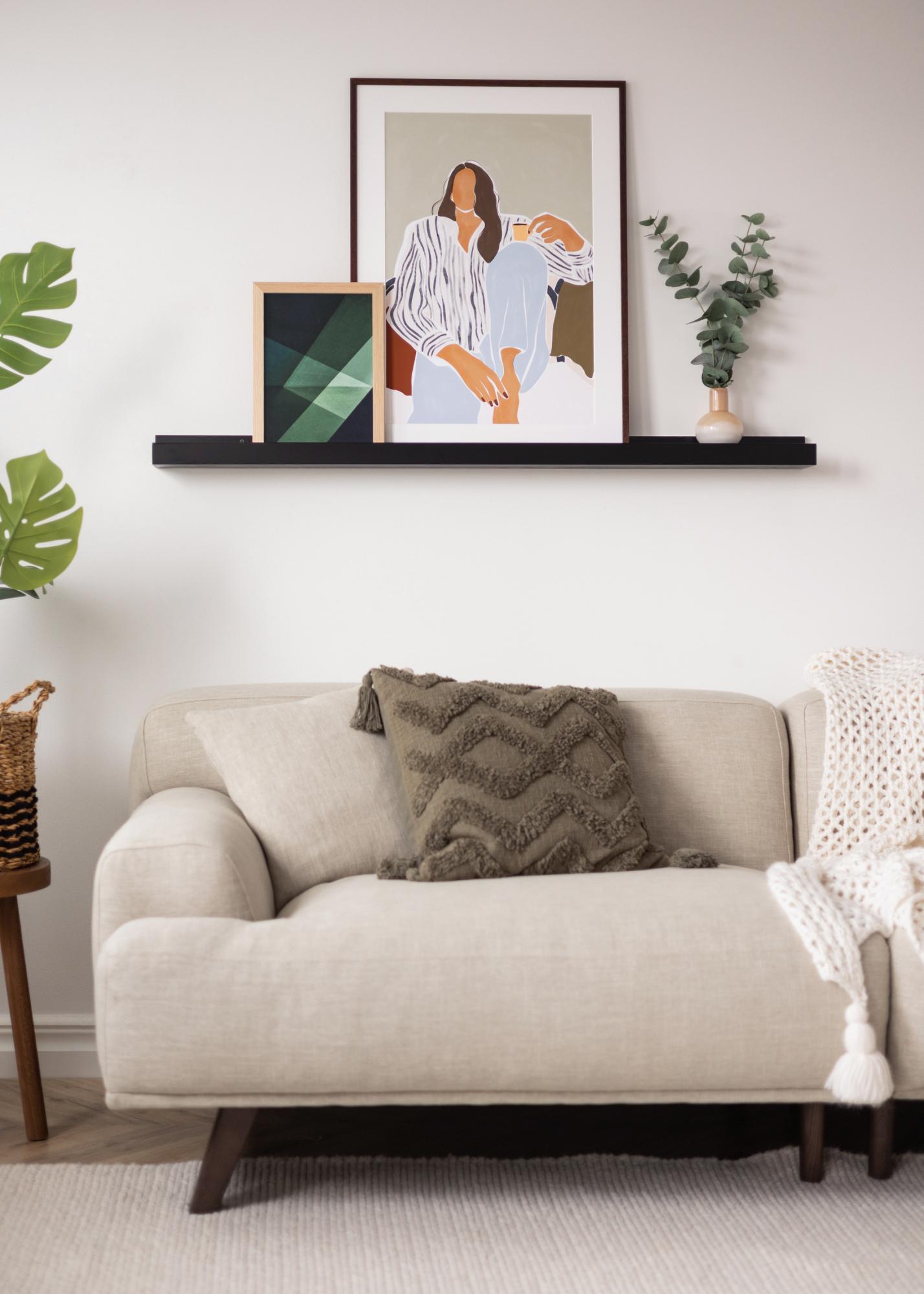 Exiba e varie sua arte de parede de forma simples e elegante com uma prateleira para quadros elegante! Esta prateleira para quadros é feita de MDF e tem uma pintura preta moderna com um acabamento semi-brilhante. O suporte para quadros tem um design elegante com linhas retas e simples e uma sensação minimalista. A superfície da prateleira possui uma ranhura fresada no centro que serve de apoio para seus quadros e lhes dá um ângulo elegante enquanto estão apoiados contra a parede.