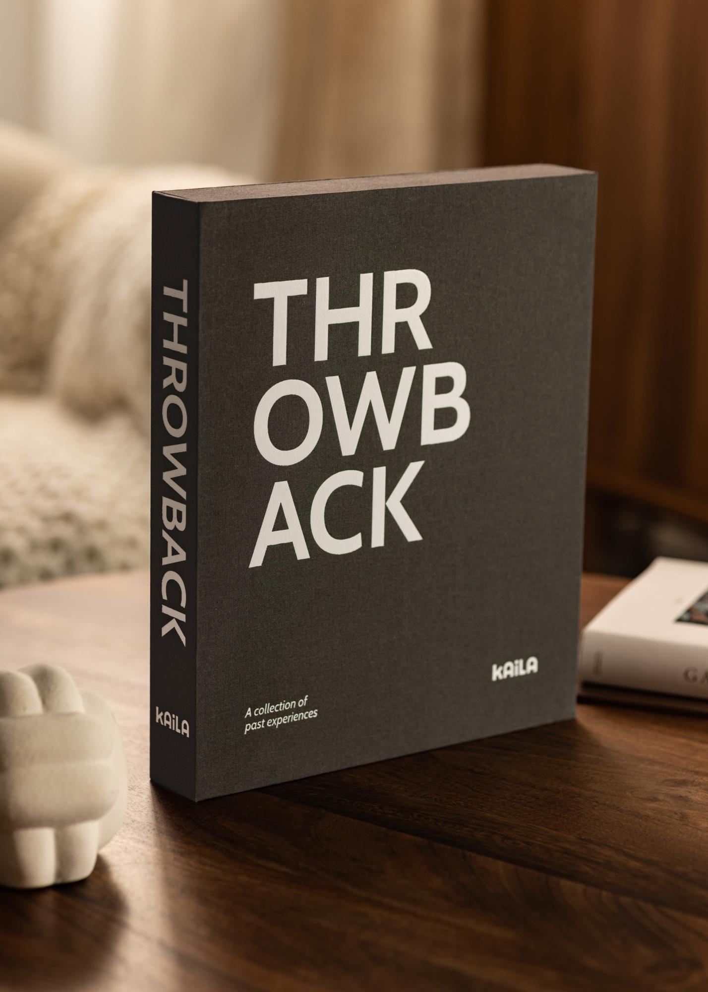 Este é um álbum de fotos muito moderno, embalado de forma luxuosa como um elegante livro de mesa de café - um chamado Coffee Table Photo Album. O álbum de fotos é desenhado como uma caixa exclusiva que abre para acessar o conteúdo. A capa é elegantemente revestida de tecido preto e uma impressão branca com o texto "THROWBACK" enfeita tanto a frente quanto a lombada do álbum. Esse conceito familiar de retrospectiva dá ao álbum de fotos uma sensação moderna e um pouco ousada, pois realmente se destaca dos estilos clássicos de álbuns. O álbum também tem um subtítulo que diz "Uma coleção de experiências passadas" impresso no canto inferior esquerdo.