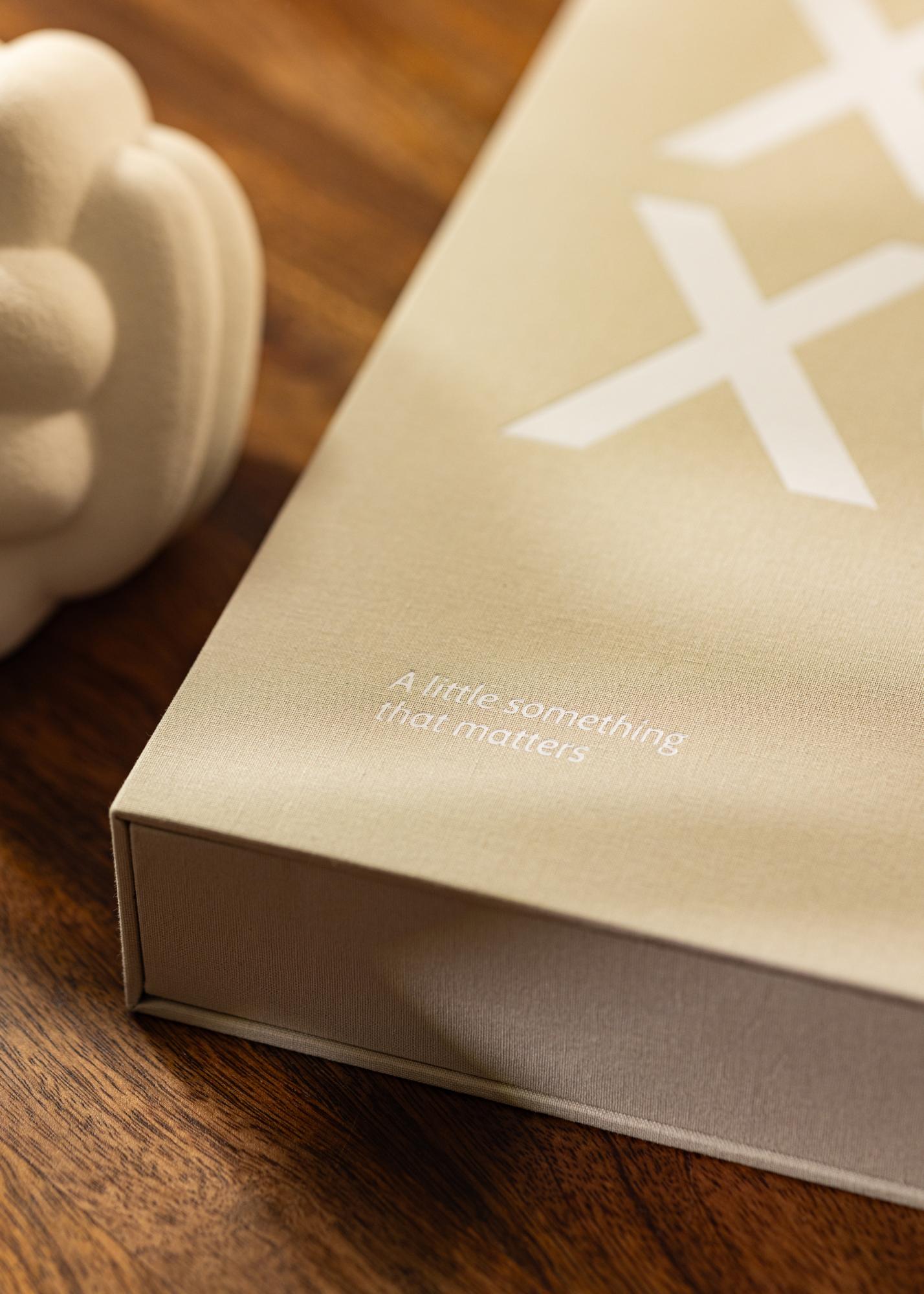 Este elegante álbum de fotos é desenhado como um elegante livro de mesa de café e é chamado, por essa razão, de Álbum de Fotos de Mesa de Café. A capa é elegantemente revestida com tecido cinzento e na frente e na lombada do álbum há uma impressão em branco com a conhecida saudação de despedida "XOXO", que significa beijos e abraços. Este título moderno também é complementado por um subtítulo que diz "Algo pequeno que importa" e está impresso no canto inferior esquerdo do álbum. É um álbum de fotos muito elegante com um design diferente e divertido que certamente se destaca.