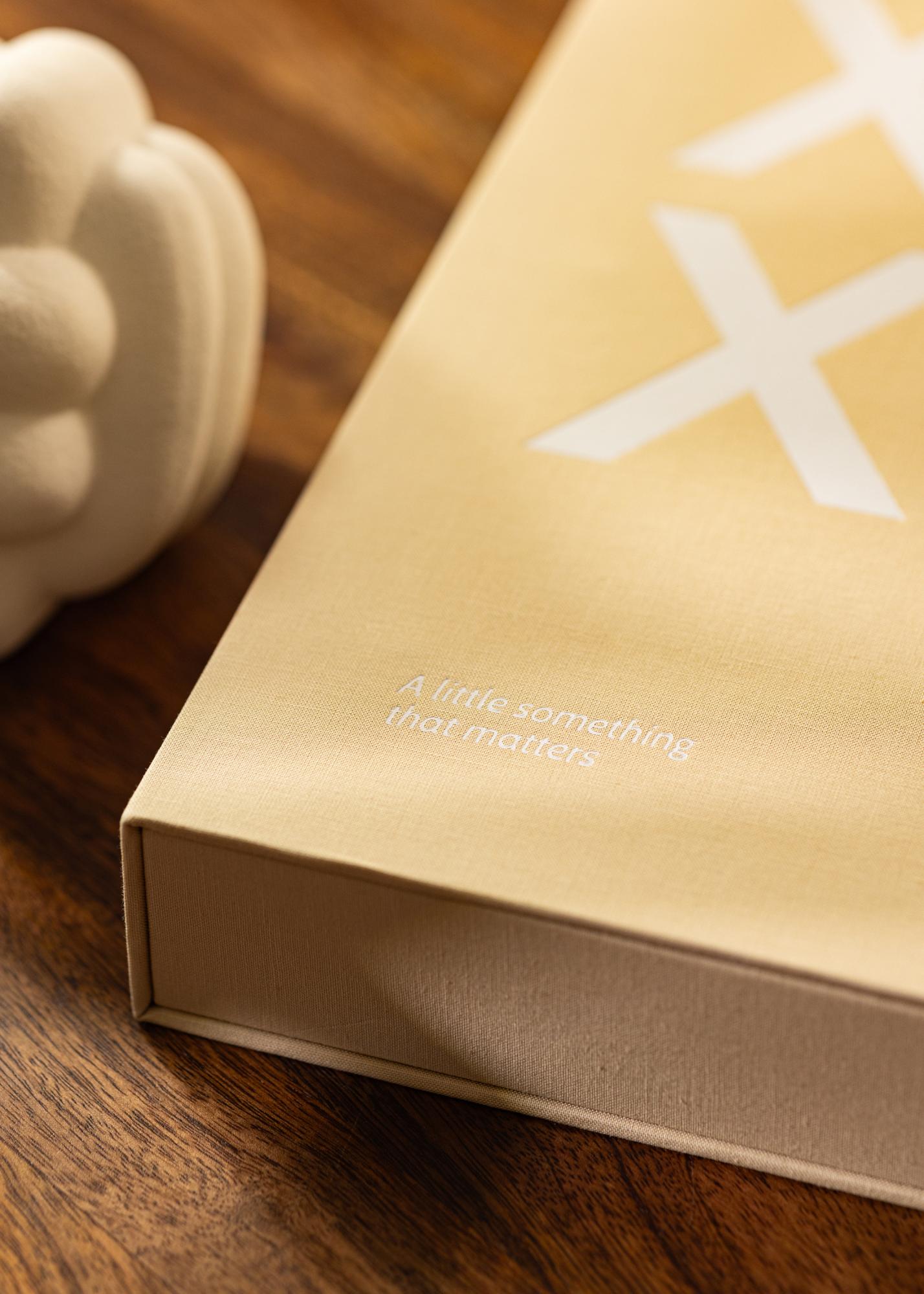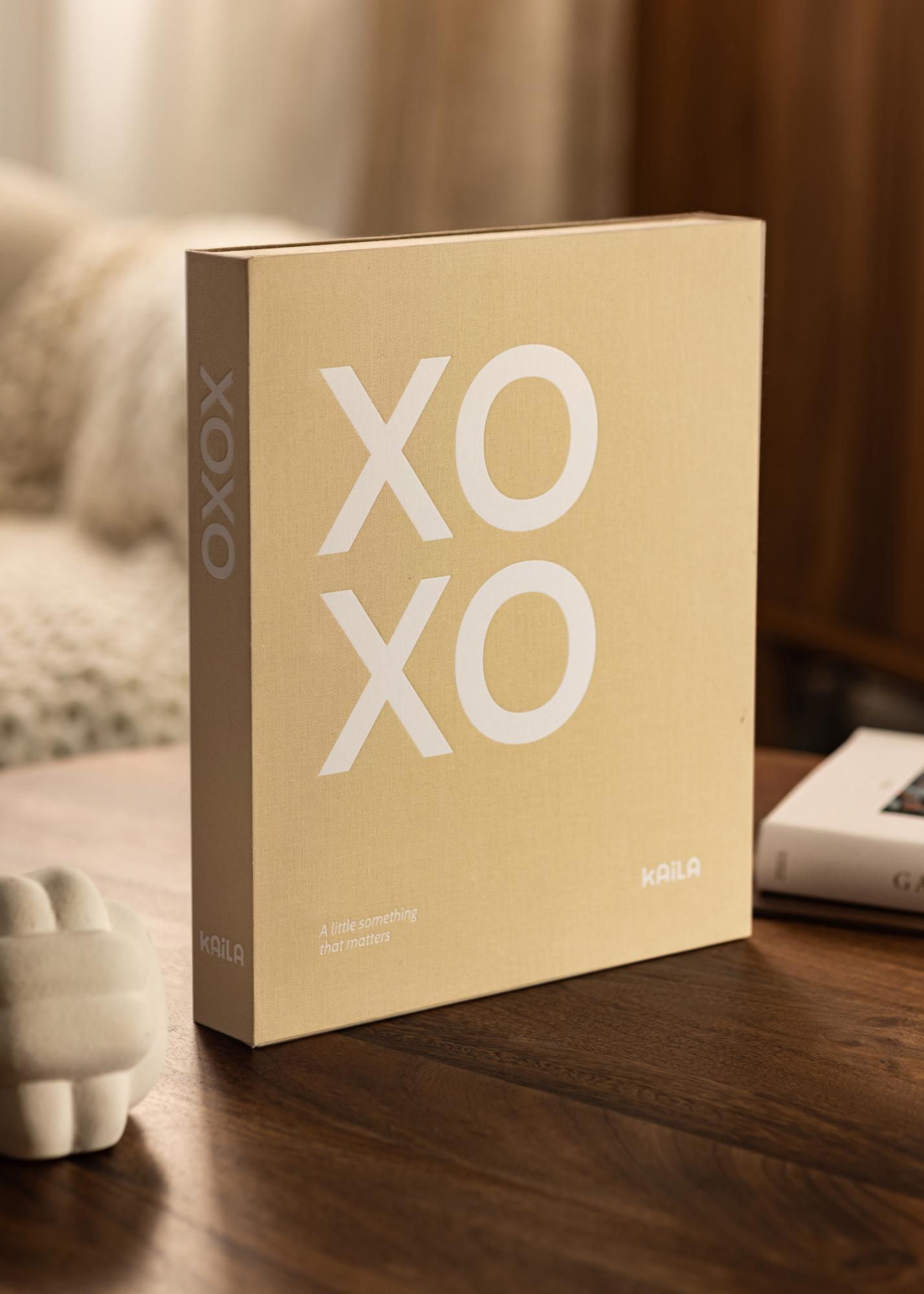 Este elegante álbum de fotos é desenhado como um elegante livro de mesa de café e é chamado, por essa razão, de Álbum de Fotos de Mesa de Café. A capa é elegantemente revestida em tecido bege e na frente e na lombada do álbum há uma impressão em branco com a conhecida saudação de despedida "XOXO", que significa beijos e abraços. Este título elegante também é complementado por um subtítulo que diz "Algo pequeno que importa" e está impresso no canto inferior esquerdo do álbum. É um álbum de fotos muito elegante com um design diferente e divertido que certamente se destaca.