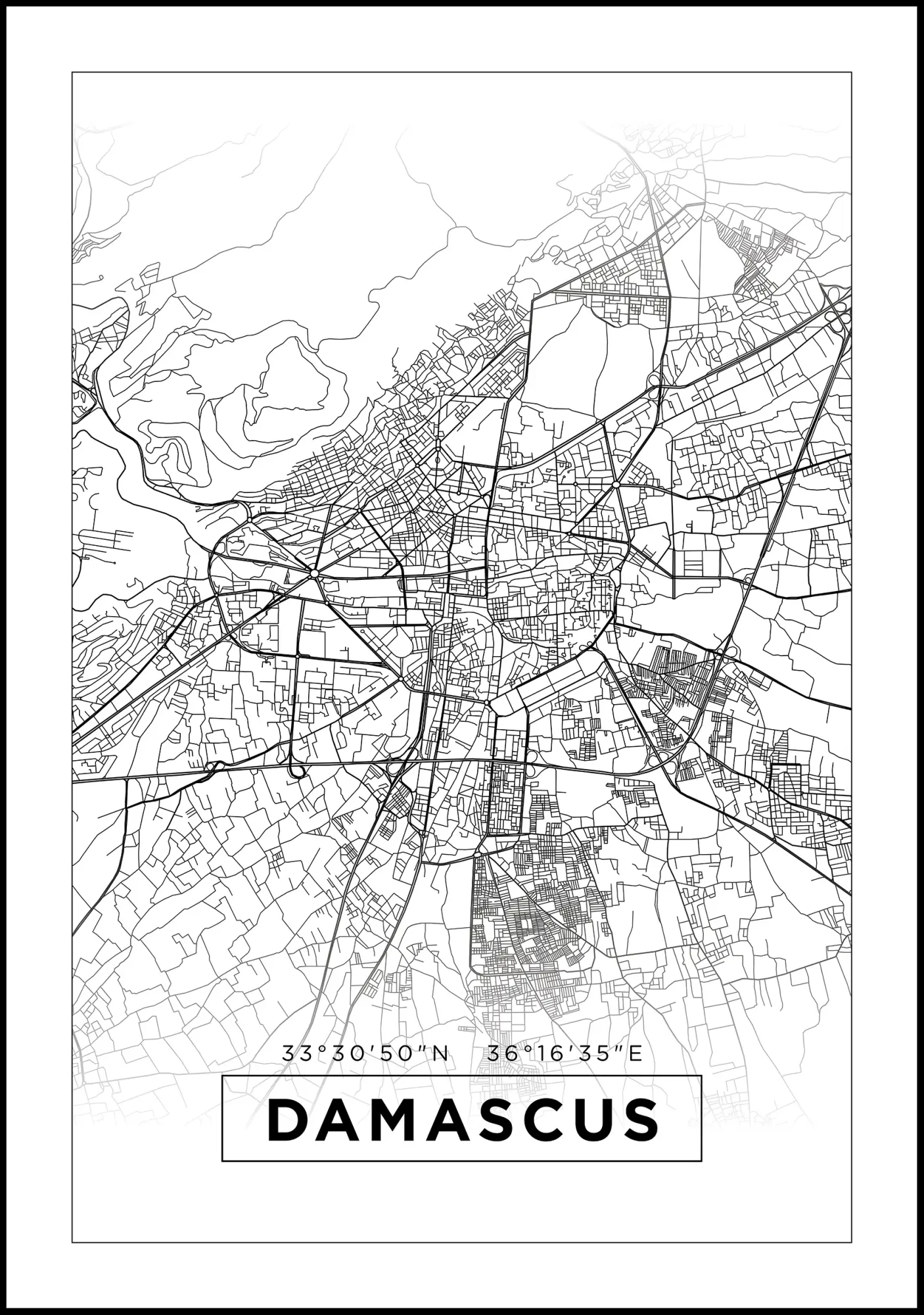 Elegante e sofisticado é o que descreve este mapa da cidade de Damasco. Em preto, as ruas da cidade são desenhadas num fundo branco. Na parte superior e inferior, o preto se desvanece para o branco e é então enquadrado por uma fina moldura preta. Na parte inferior da imagem, "Damasco" é escrito em letras maiúsculas pretas e acima estão as coordenadas da cidade; o nome "Damasco" é enquadrado exatamente como o mapa em geral. Na borda externa do póster, há uma margem branca mais larga que dá aquele toque extra.