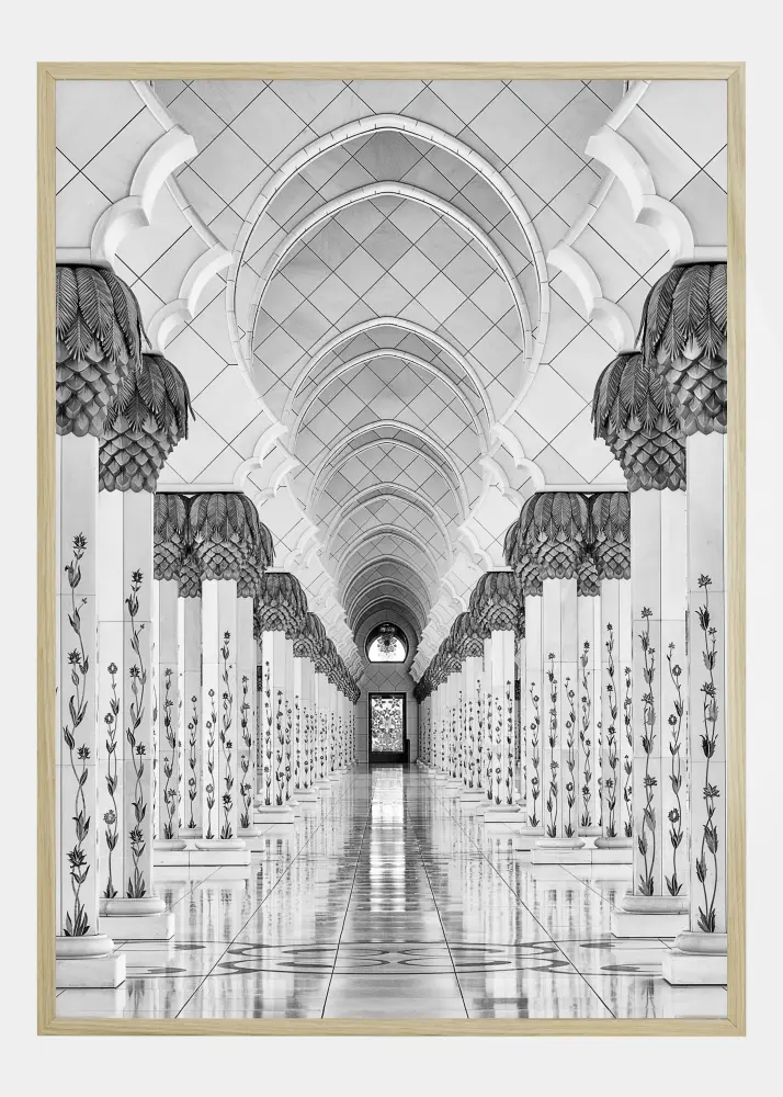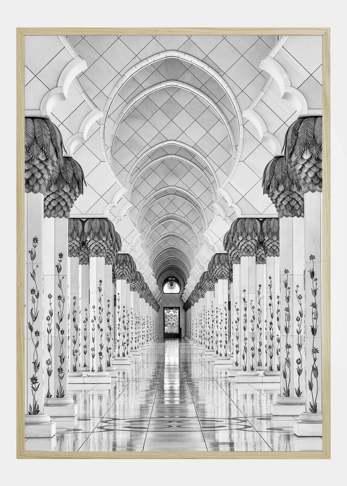 Um póster em preto e branco que cria uma ilusão de profundidade. Duas fileiras de colunas levam a uma porta de vidro distante. As colunas são lindamente decoradas com flores. A luz natural entra pela porta de vidro e cria um reflexo no chão. Pendure esta impressão para criar uma sensação de espaço extra.