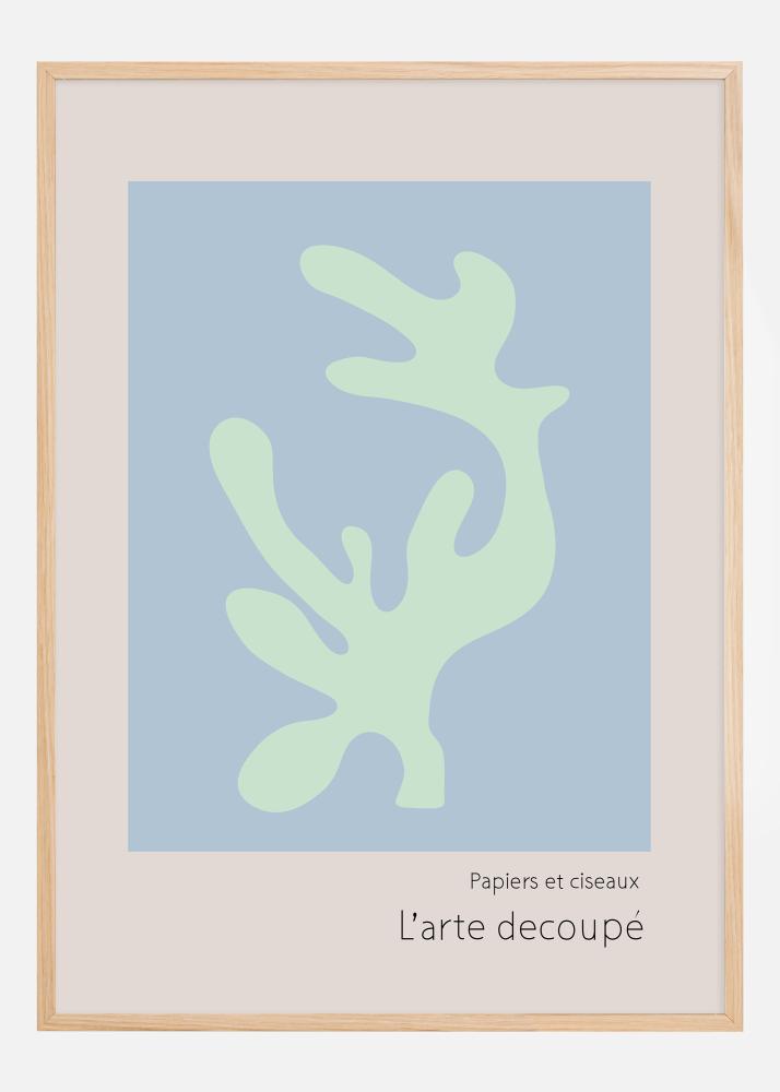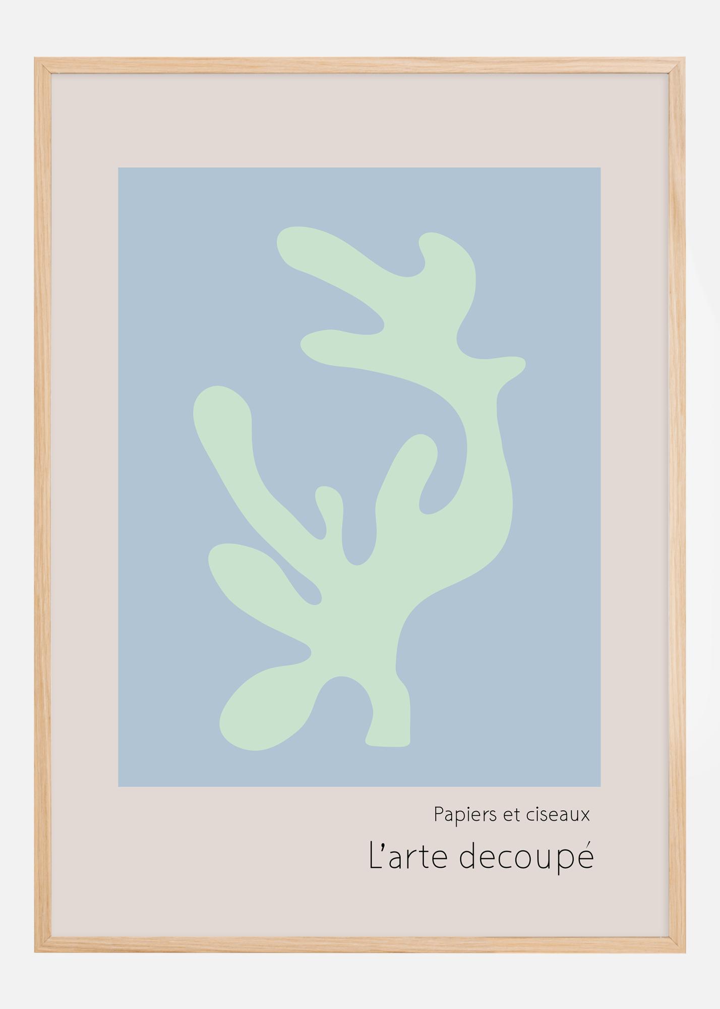 Este pôster sofisticado e minimalista homenageia 'L'arte decoupé', a arte de cortar papel, que é uma forma de expressão artística elegante e atemporal. Retrata uma forma abstrata em um tom pastel verde calmante que flutua sobre um fundo azul suave, criando uma ilusão de leveza e efemeridade. A forma simples, que é tanto orgânica quanto aberta à interpretação, convida o observador a explorar os espaços negativos e encontrar seu próprio significado no padrão recortado.