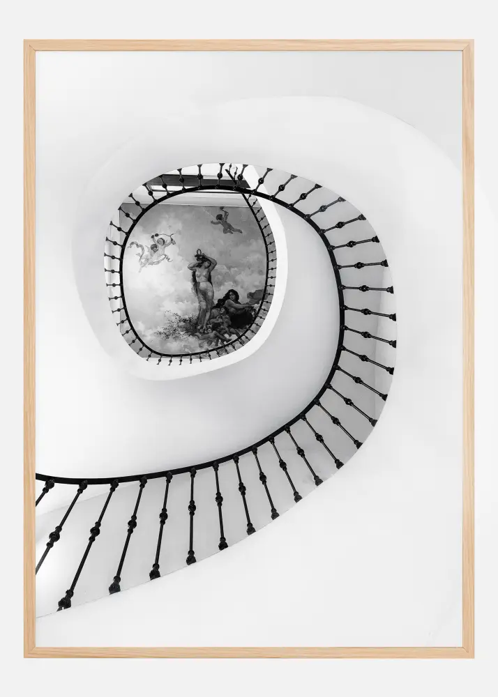 Um belo póster em preto e branco com uma escada em espiral. Graças ao corrimão preto em ferro forjado, esta bela escada em espiral leva si a uma maravilhosa pintura mural com mulheres nuas e querubins. Pendure esta impressão numa parede branca simples e crie uma sensação de infinito.