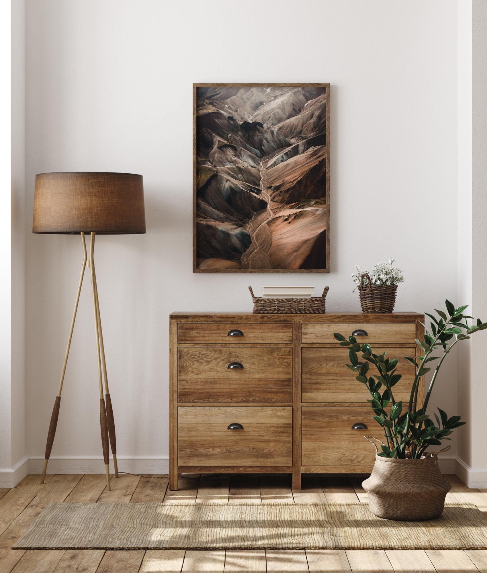 Uma impressionante impressão aérea de montanha com as coloridas Montanhas Ryholite. Os tons suavemente coloridos de outono, em tons de marrom, criam uma sensação de calor e tornam este um póster inspirador para pendurar em sua casa. Siga a trilha solitária e veja para onde ela o leva neste belo caminho natural.