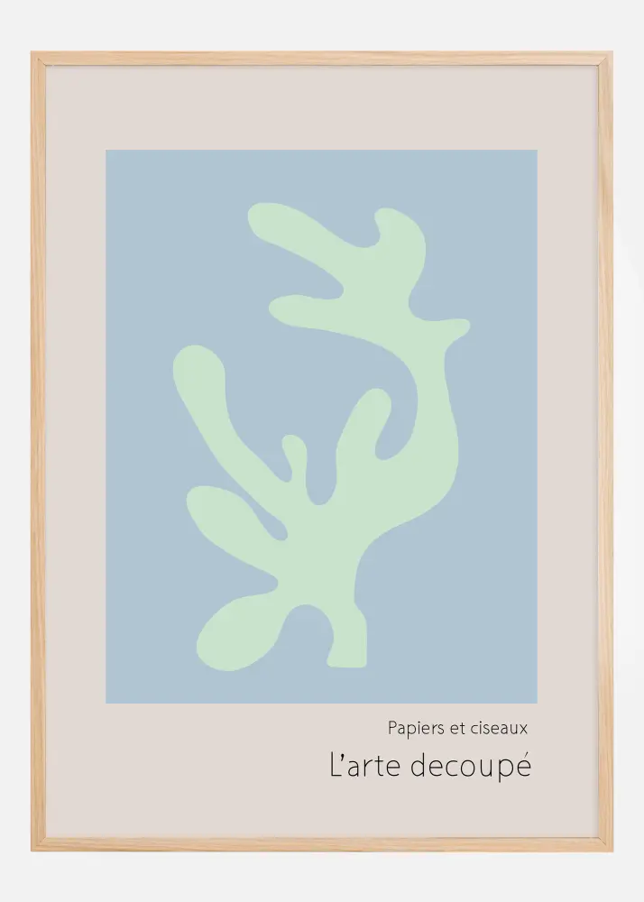 Este pôster sofisticado e minimalista homenageia 'L'arte decoupé', a arte de cortar papel, que é uma forma elegante e atemporal de expressão artística. Ele retrata uma forma abstrata em um tom verde pastel calmante que flutua sobre um fundo azul suave, criando uma ilusão de leveza e efemeridade. A forma simples, que é tanto orgânica quanto aberta à interpretação, convida o observador a explorar os espaços negativos e encontrar seu próprio significado no padrão cortado.