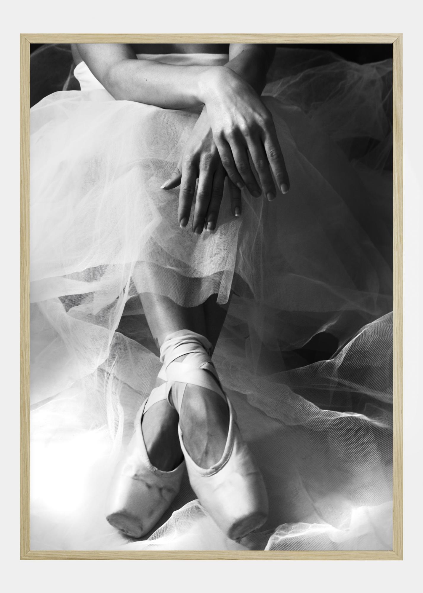 Um elegante póster com uma bailarina posando sentada antes de uma dança. Siga os pés e mãos cruzados enquanto ela espera sua vez. Este póster fica perfeito numa parede neutra.