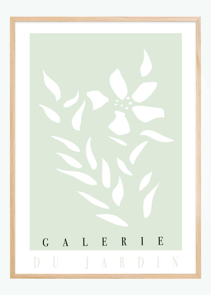 Este cartaz sofisticado e minimalista da Galerie du Jardin destaca a beleza da simplicidade. O motivo consiste em uma flor estilizada e branca contra um fundo cinza calmante, criando uma atmosfera harmoniosa e relaxante. As folhas brancas se destacam contra o tom cinza, proporcionando uma sensação limpa e moderna que é perfeita para todos que apreciam um design discreto e elegante.