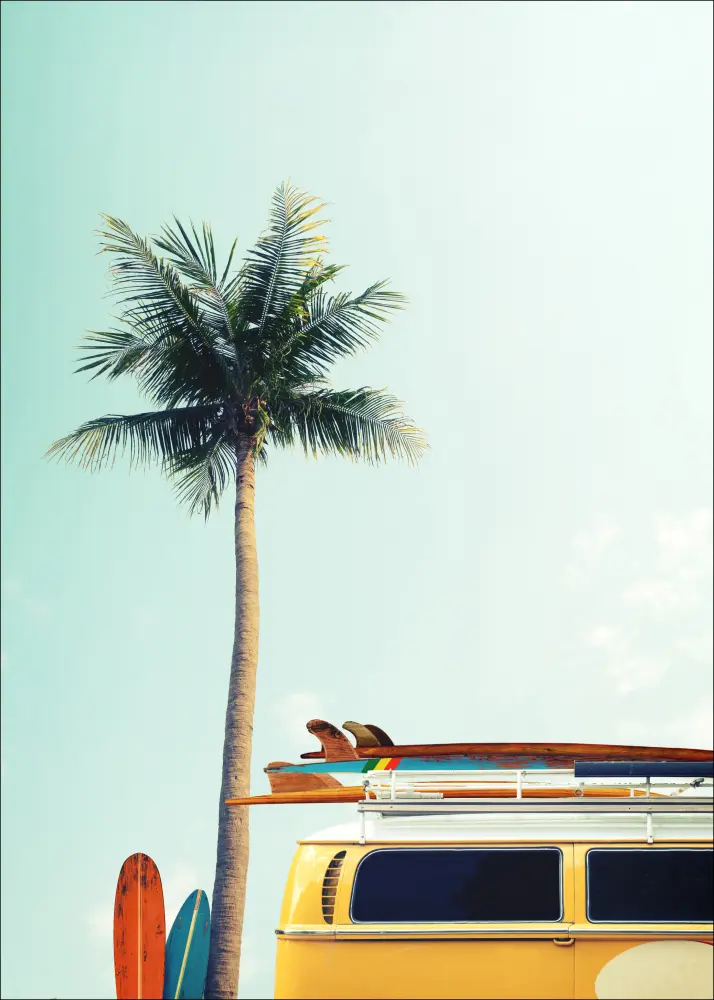 Um póster fotográfico com o clássico furgão Volkswagen com as suas pranchas de surfe, estacionado ao lado de uma palmeira sob um céu sem nuvens. Um póster colorido que transmite uma sensação maravilhosa de verão e liberdade. Combine-o com outros favoritos numa galeria de parede maior.