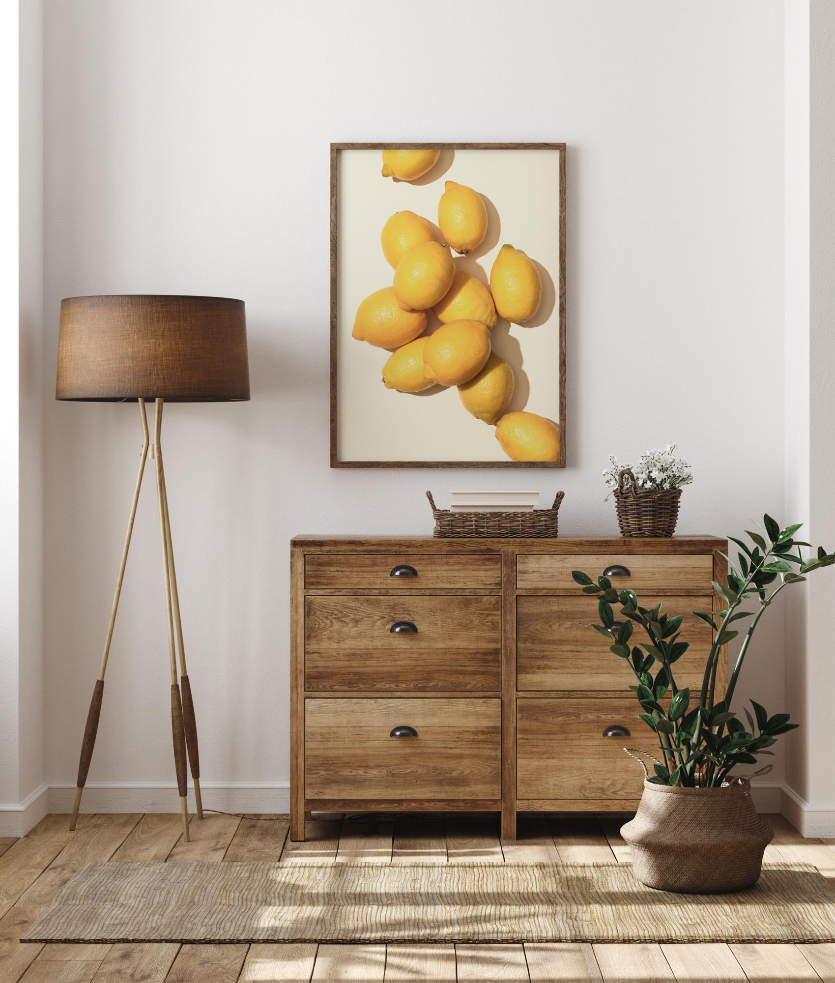 Um póster realista de limões. A luz de cima é desenhada diretamente na fruta, destacando a rugosidade da casca. A luz cria sombras que se estendem sobre o fundo branco. Sinta o cheiro da frescura desta fruta cítrica quando pendurar esta impressão na sua cozinha.
