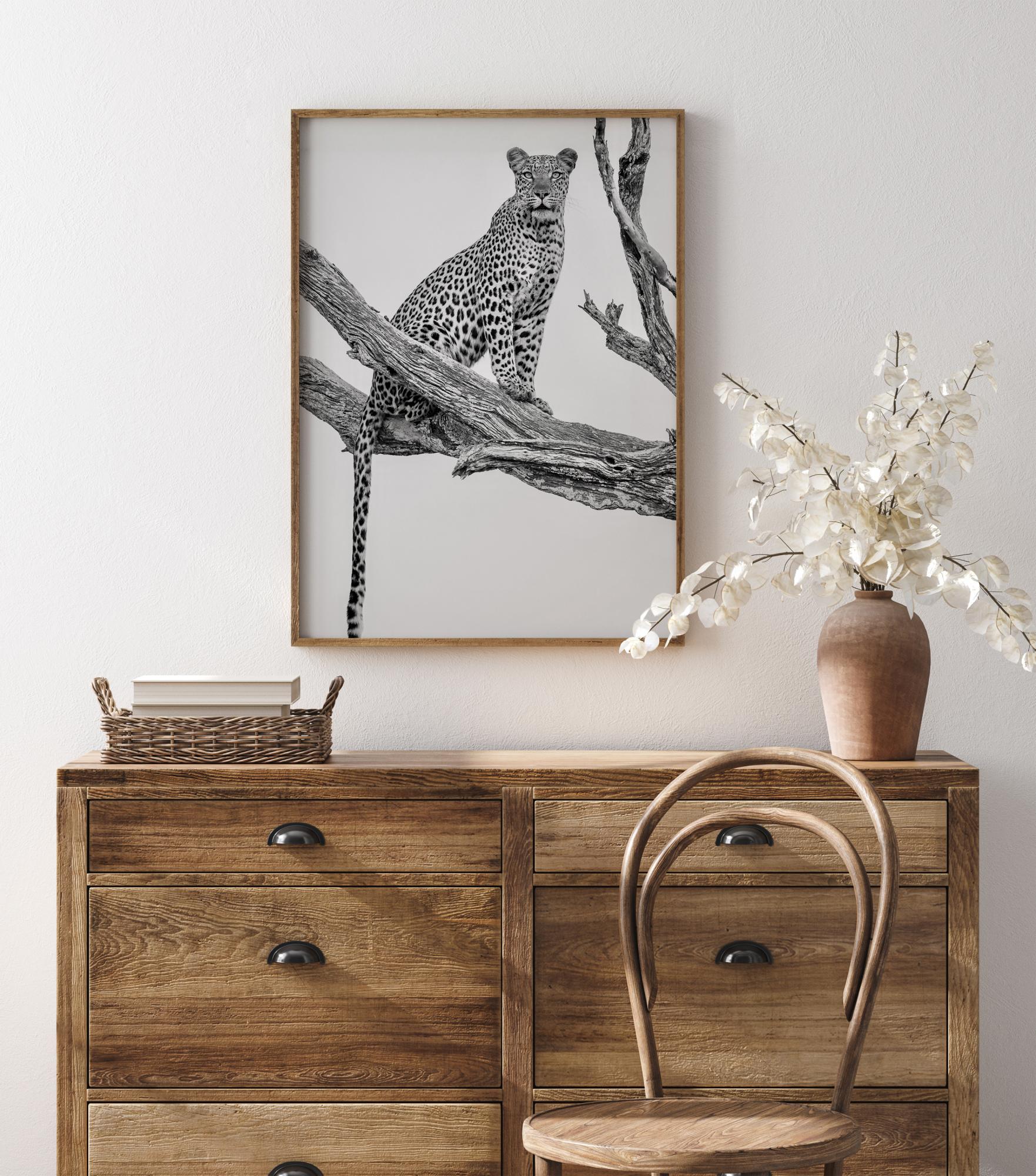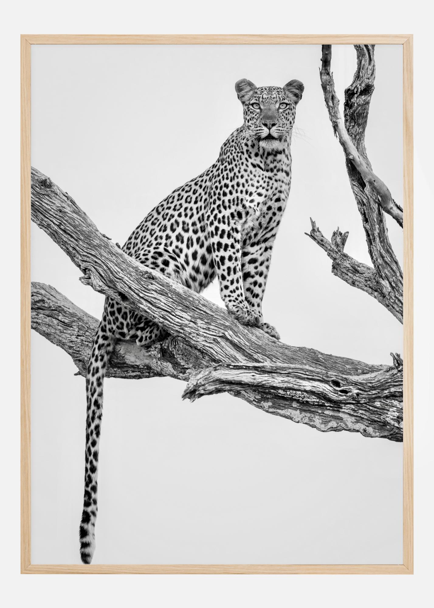 Um póster da natureza com uma leopardo sentada em guarda em um galho de árvore. A leopardo olha fixamente para longe e dá a sensação de que algo está prestes a acontecer. Sinta a expectativa com esta impressão.