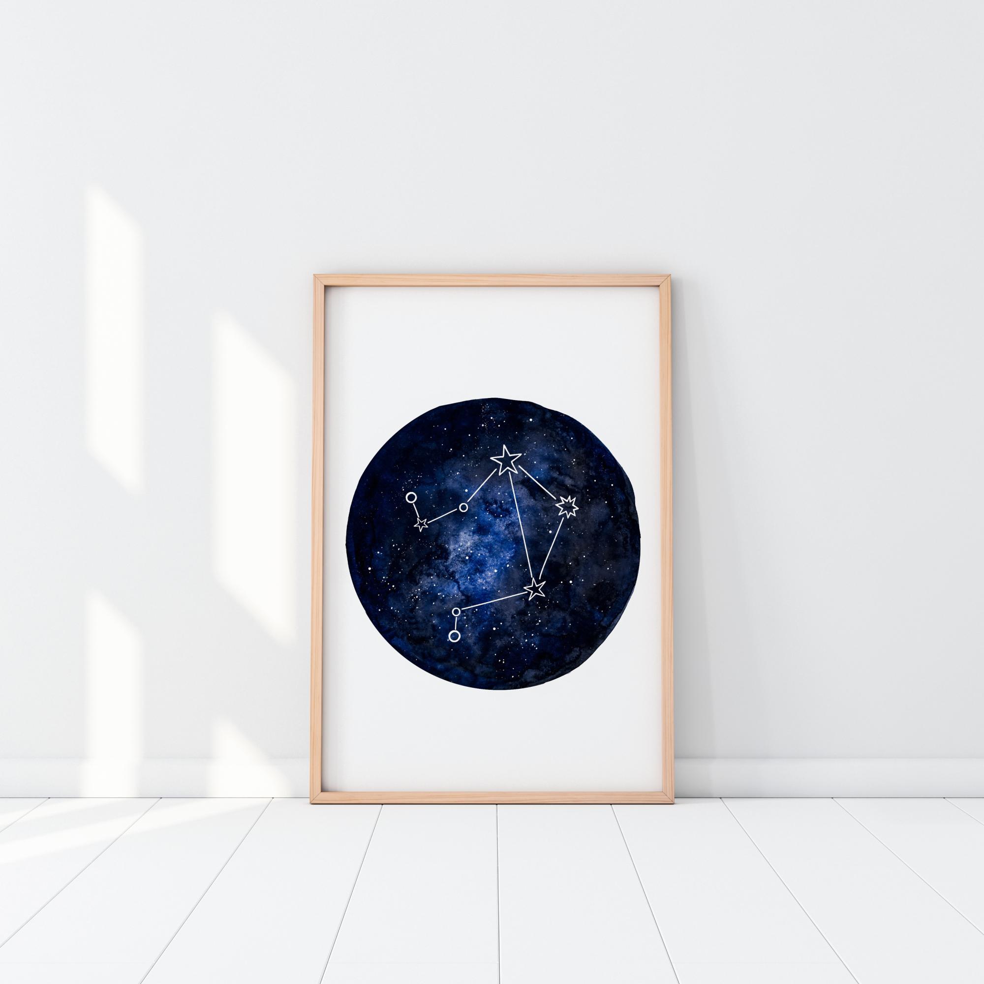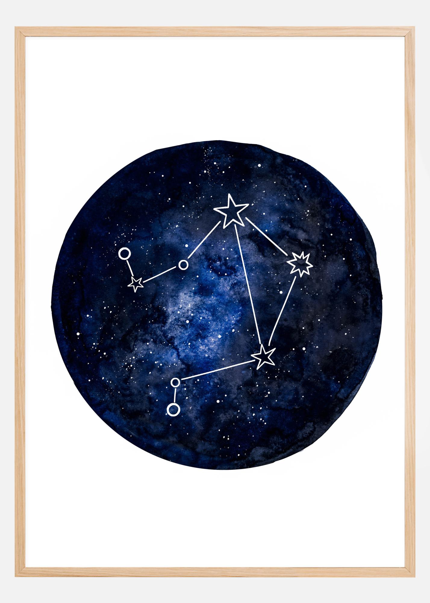 Um mapa astrológico em pequena escala da constelação de Libra. O mapa azul escuro está num fundo branco simples e é destacado por linhas brancas que mostram a constelação de Libra. Um póster que é um presente ideal para todos que nasceram sob esse signo.