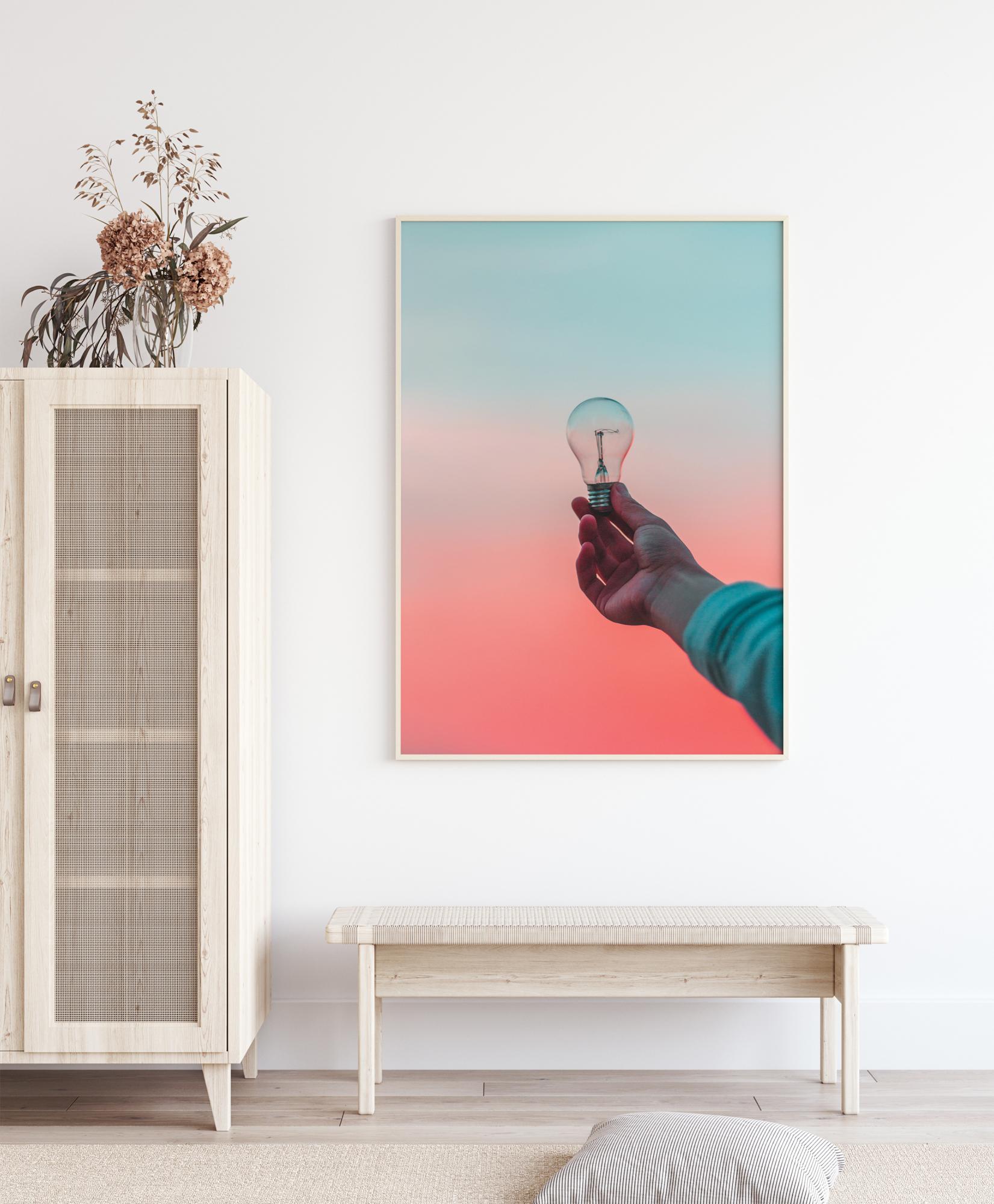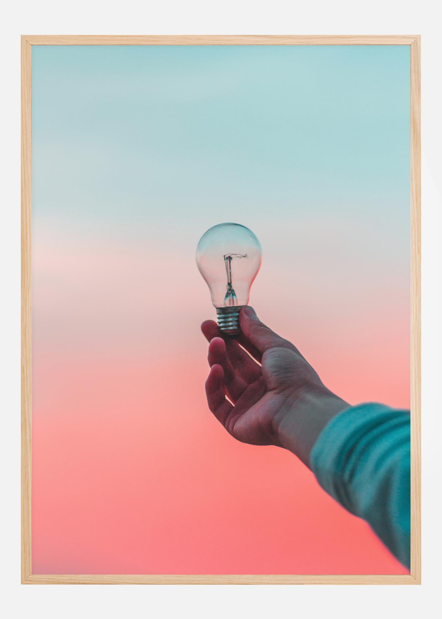 Um simples toque de uma lâmpada segurada contra o céu. O belo céu azul claro destaca a camiseta turquesa da pessoa segurando a lâmpada. A parte inferior do póster reflete um lindo tom rosa que é refletido na lâmpada. Uma impressão calmante que ficaria linda numa parede de cores pastel.