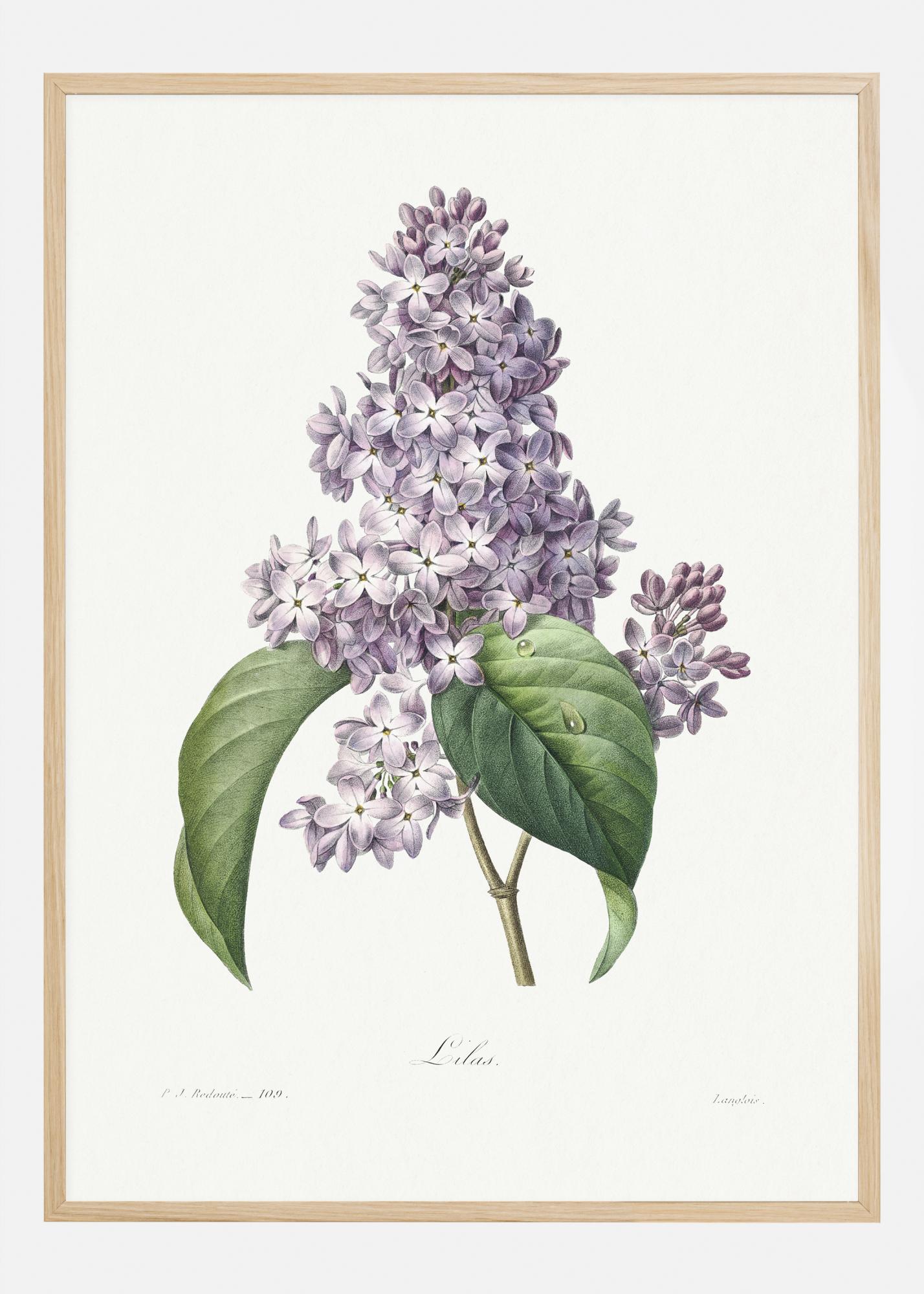 Uma bela flor roxa num fundo branco. Duas grandes folhas verdes se ramificam do caule e adicionam um toque extra de cor à impressão. Um póster a suave e relaxante que encaixa-se perfeitamente numa cozinha ou jardim de inverno.