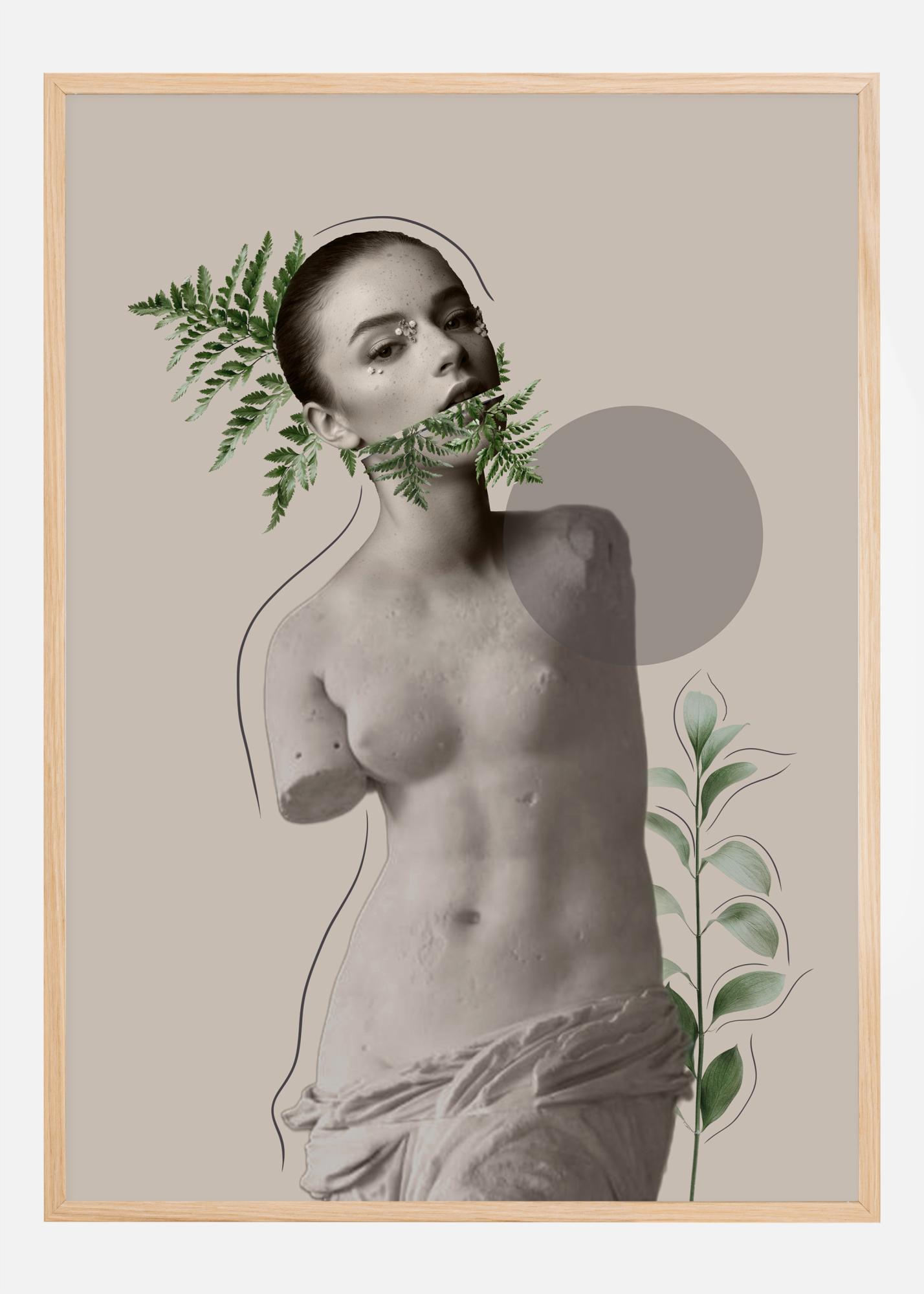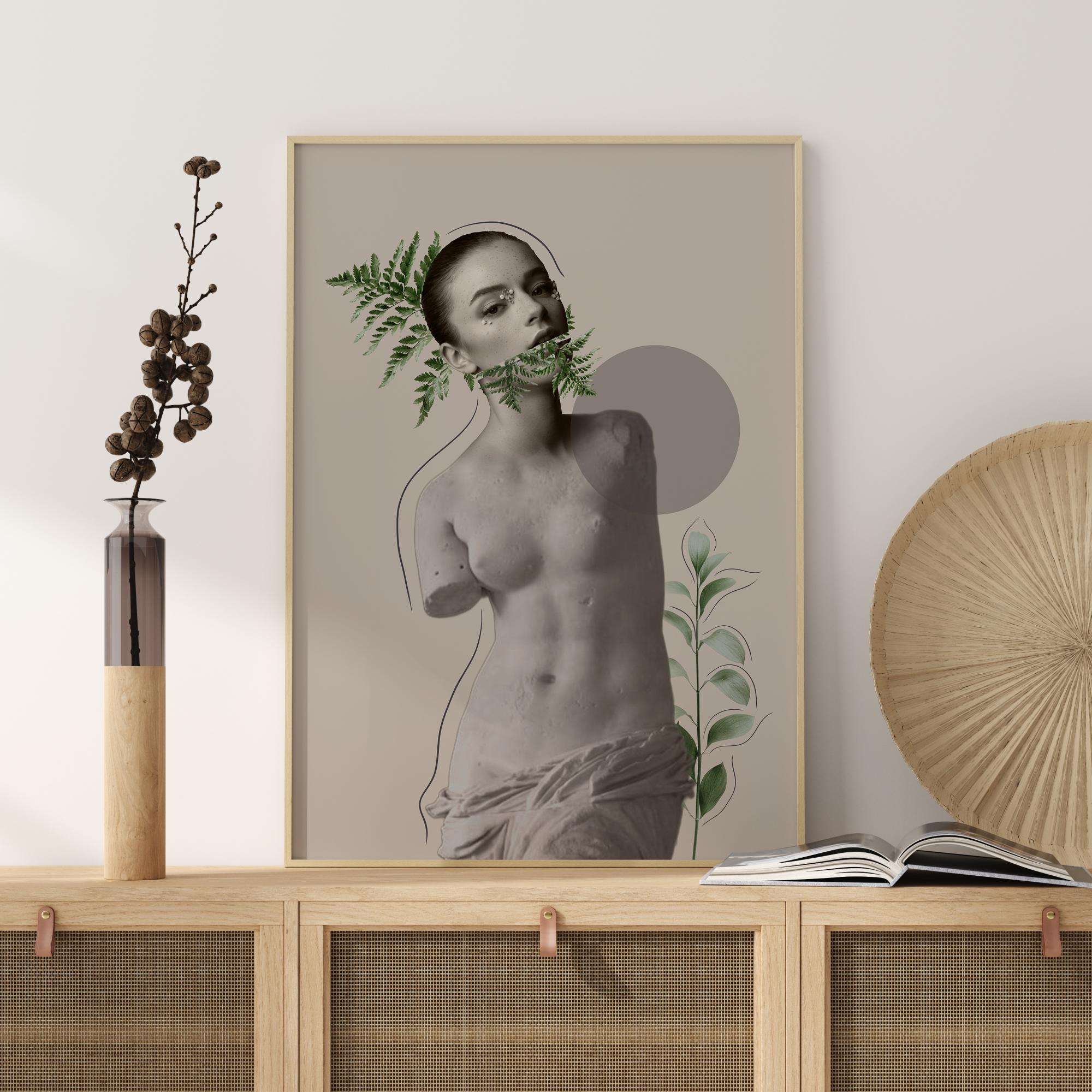 Um póster expressivo que transforma o colagem na beleza do motivo. A protagonista é uma bela mulher cercada por vegetação em uma antiga estátua grega. Uma delicada contrastante entre o moderno e o antigo. Esta imagem é uma expressão forte para uma sala de estar minimalista.