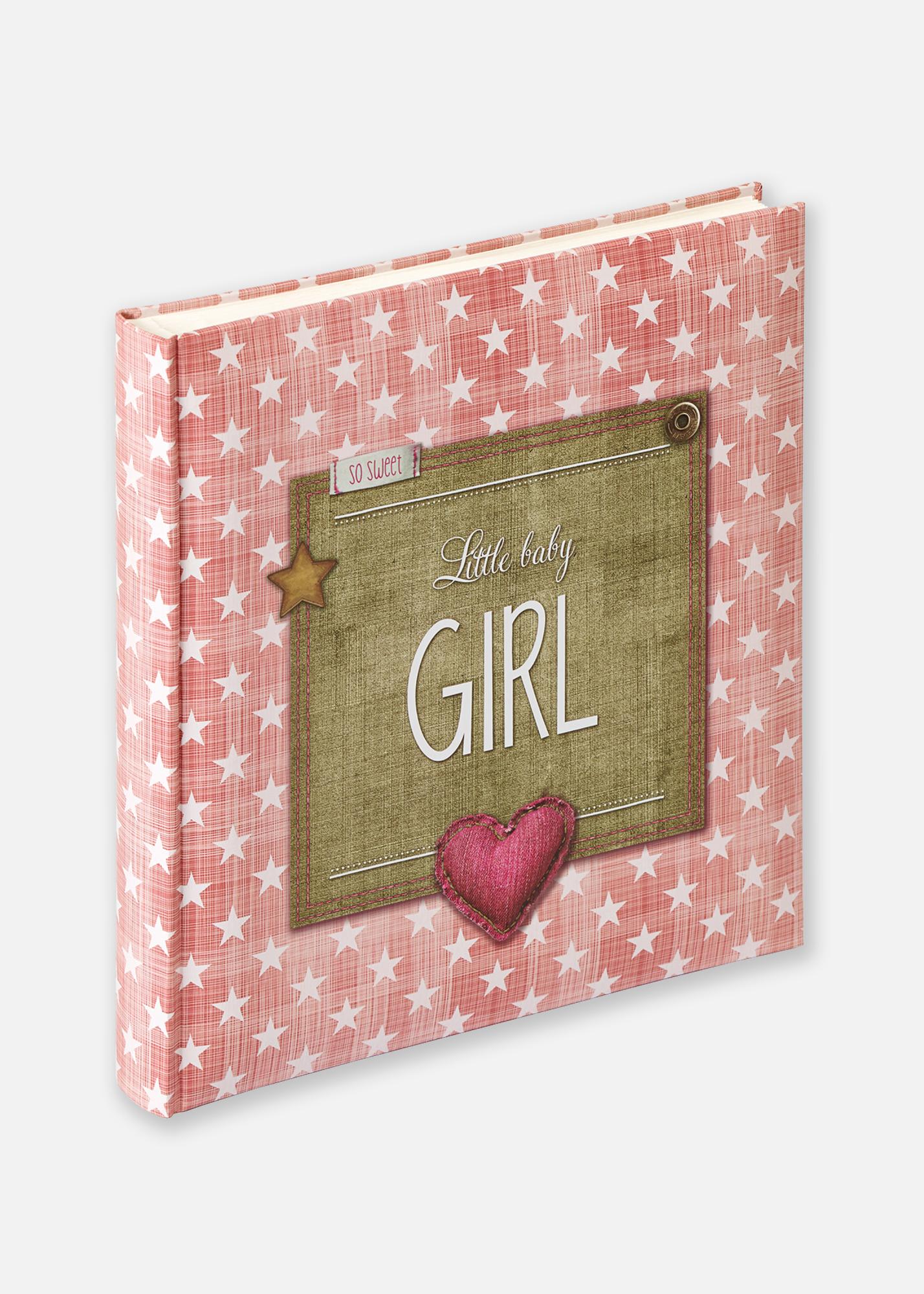 Álbum de bebé com o texto "Little Baby Girl" na capa do álbum. A capa do álbum também é decorada com muitas estrelinhas que dão uma sensação convidativa e agradável ao álbum.