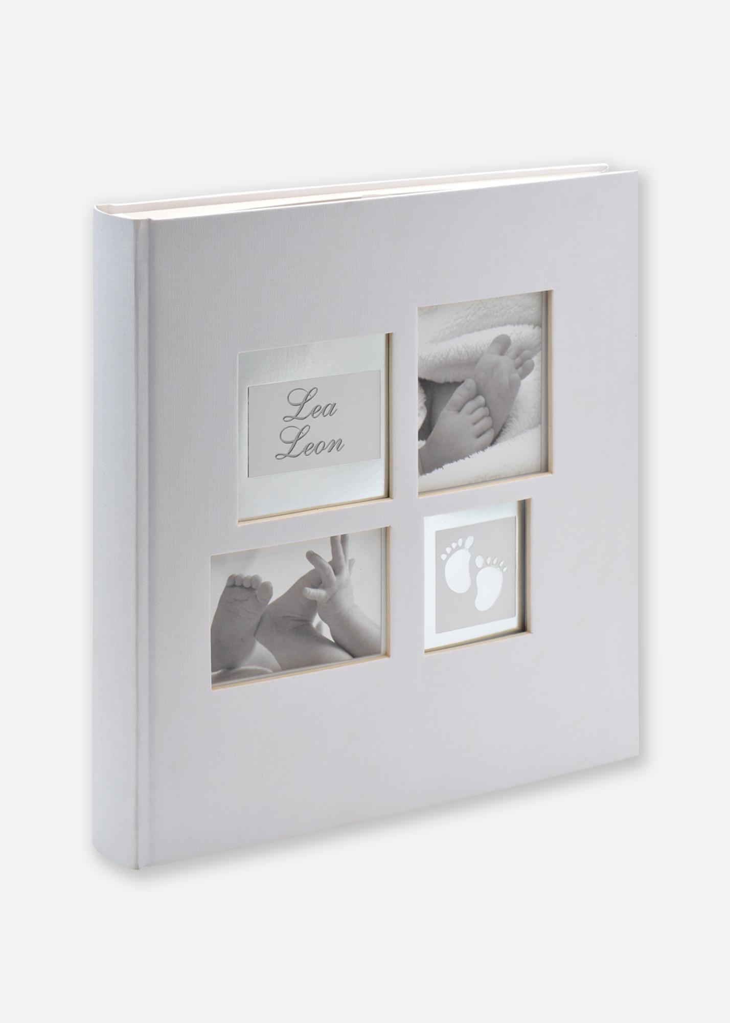 Elegante álbum de bebé em branco com um leve tom de cinzento, com espaço para 4 fotos na frente do álbum. Perfeito quando quer criar seu próprio álbum de bebé personalizado com as suas fotos favoritas.