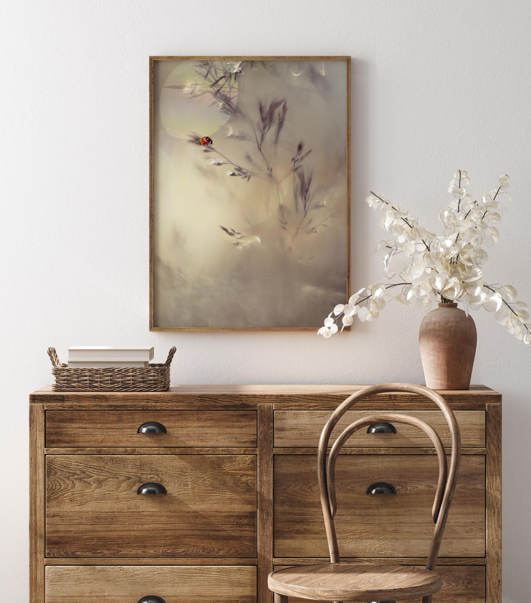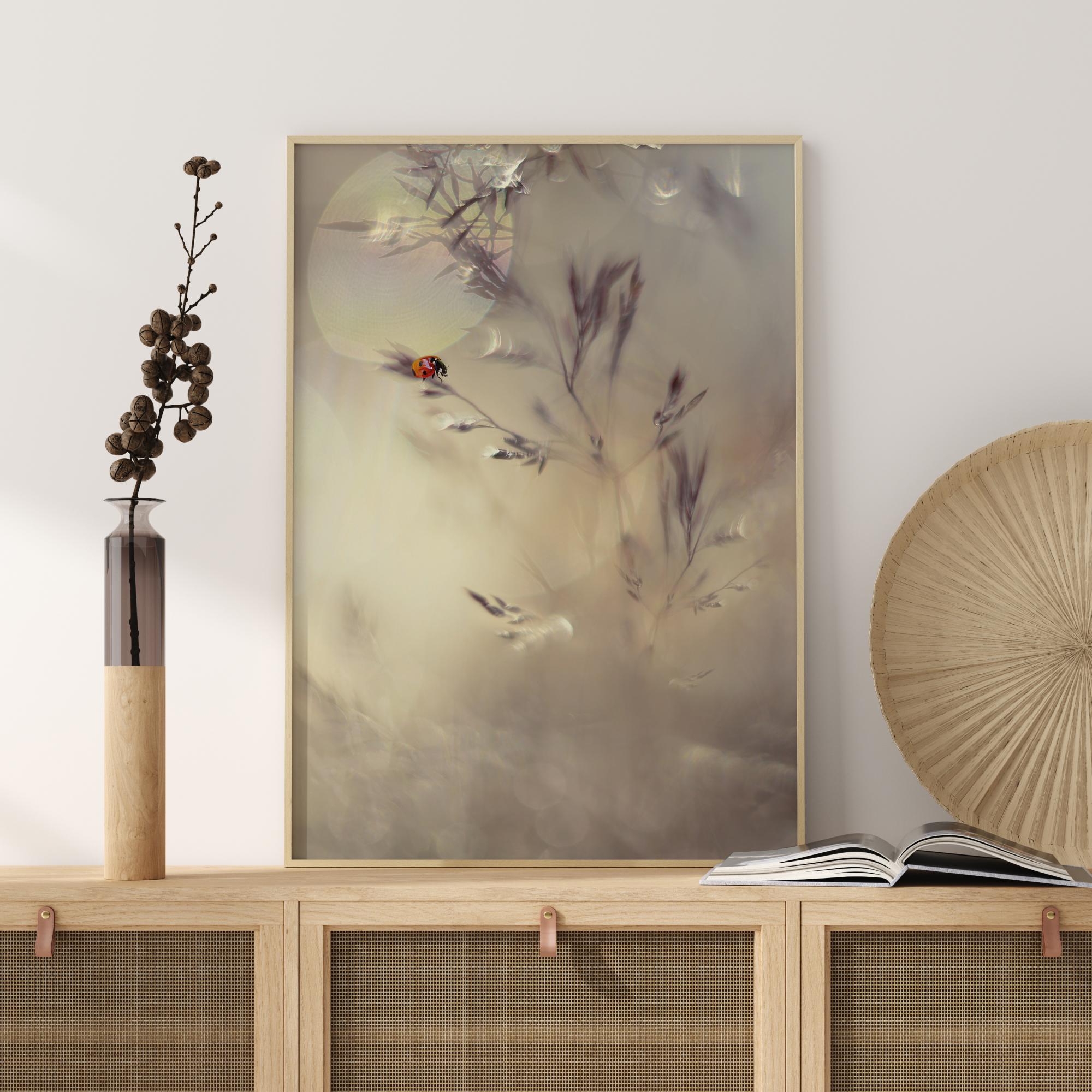 Um póster nebuloso com uma bela joaninha em uma grama seca. Com a luz do sol refletida ao longe, as cores fortes e distintas da joaninha em preto e vermelho se destacam claramente. As belas cores nebulosas transmitem uma sensação de paz e tranquilidade. Uma bela impressão para pendurar em um quarto.
