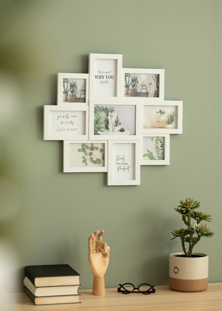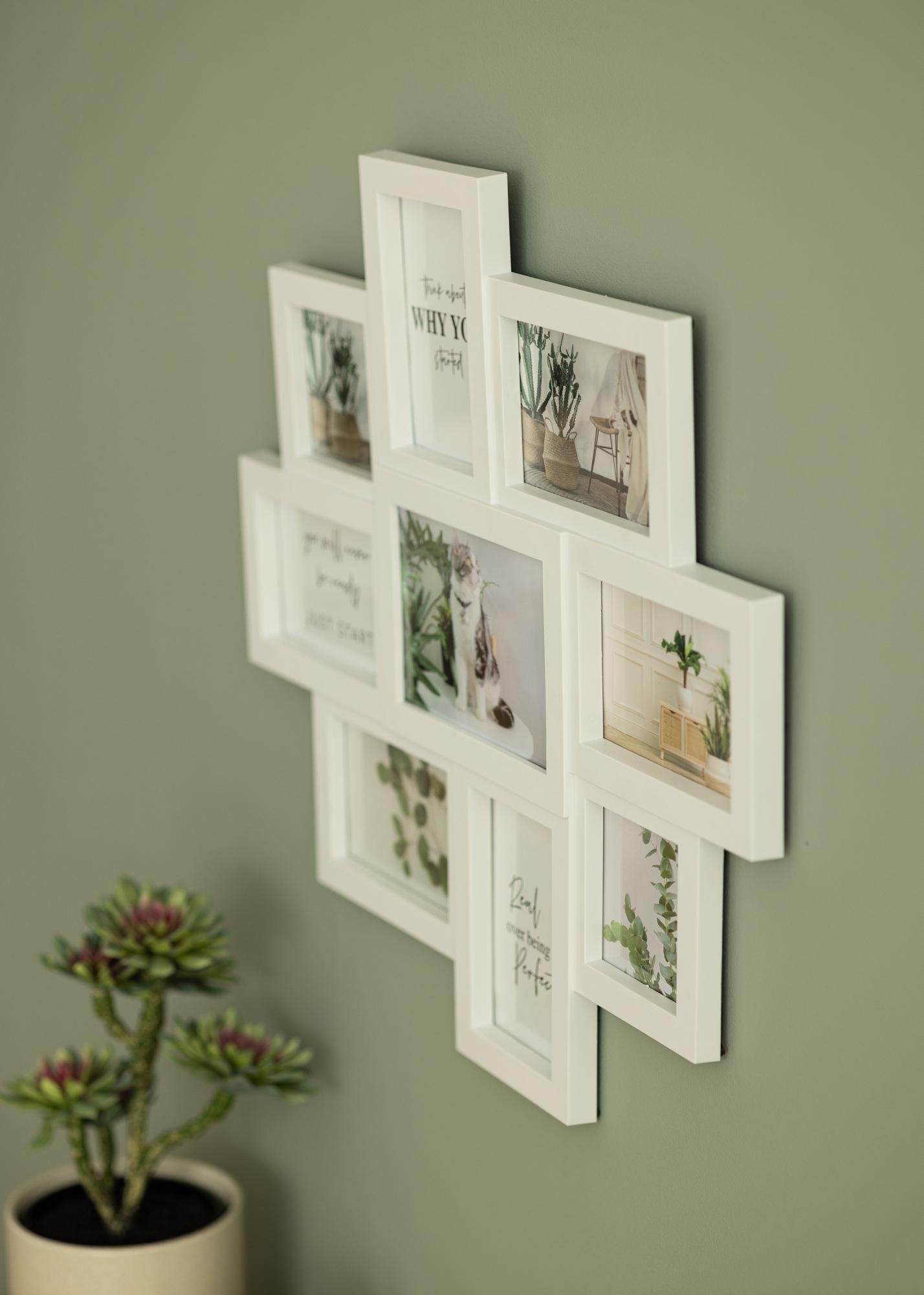 Com este elegante quadro de colagem, pode reunir todas as suas fotos favoritas num único quadro! O quadro de fotos comporta um total de 9 fotos; 2 fotos de 10x10 cm, 6 fotos de 10x15 cm e 1 foto de 13x18 cm. Além disso, pode colocar fotos tanto na vertical quanto na horizontal, o que permite mais flexibilidade na escolha das fotos. O quadro tem uma forma assimétrica que proporciona uma expressão moderna e na moda.