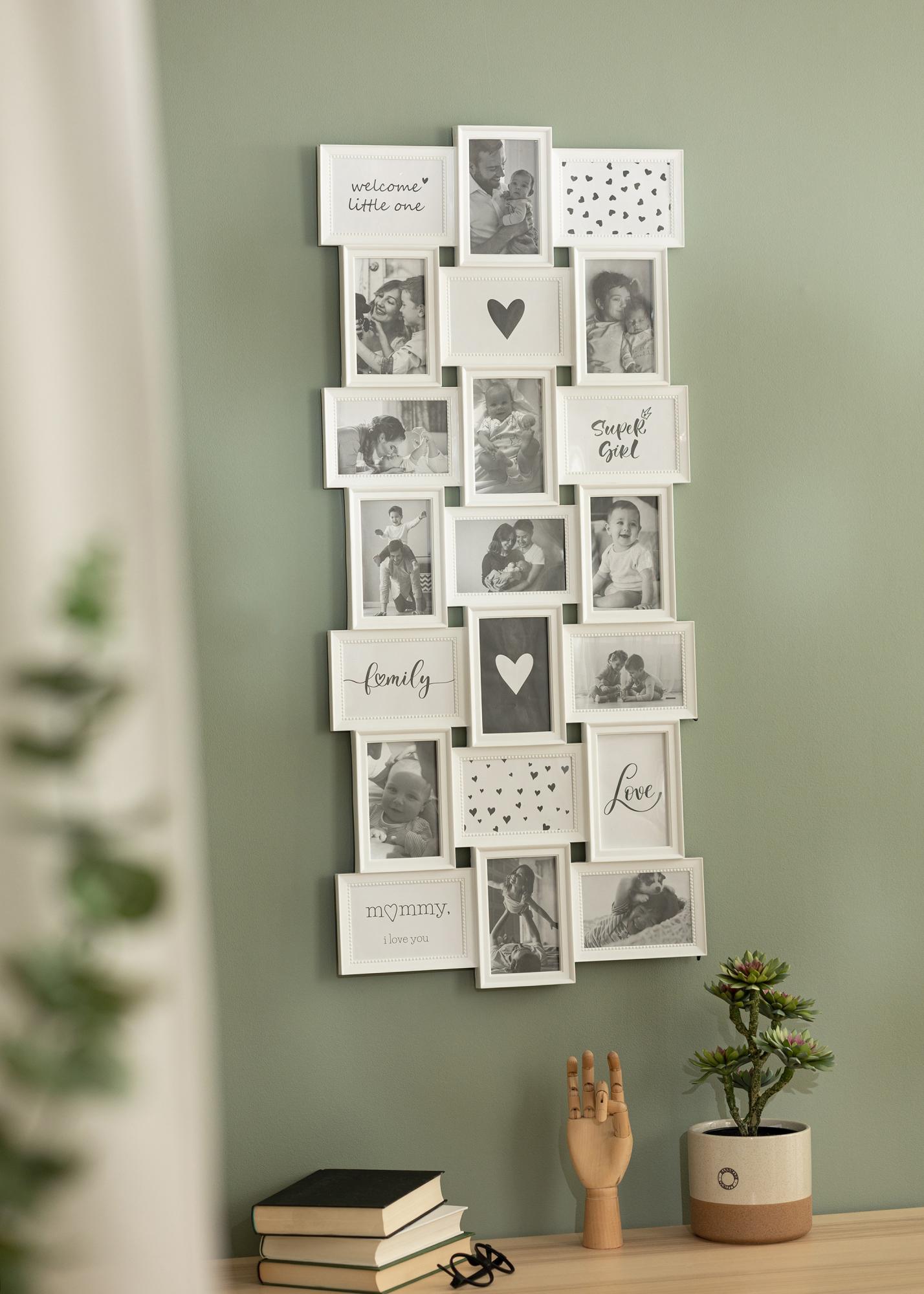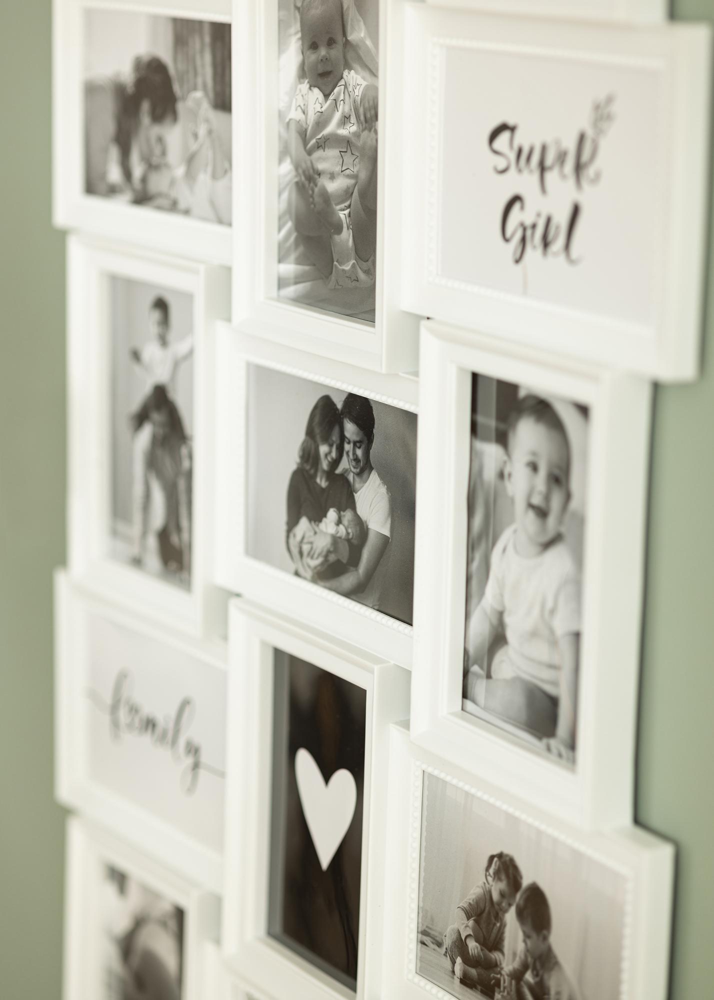 Este quadro de colagem comporta até 21 fotos de 10x15 cm. Isso permite que Coloque todas as suas fotos favoritas de parentes, amigos e família. Além disso, se combinar suas fotografias com imagens de citações ou motivos gráficos, terá uma decoração que é ao mesmo tempo bonita e emocionante!