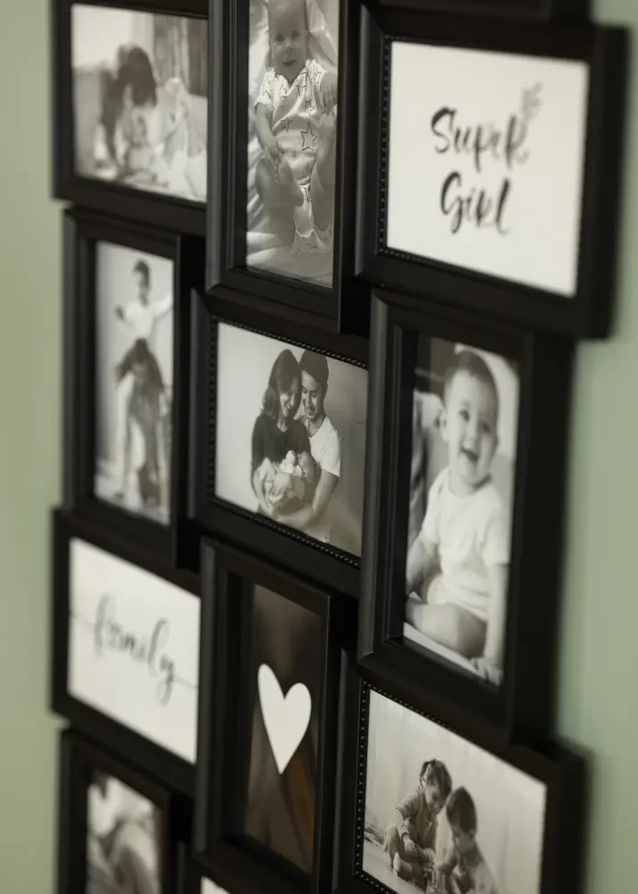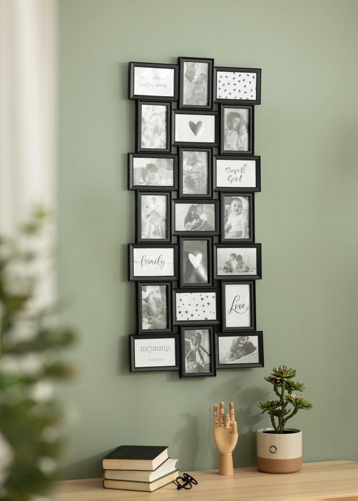 Você tem uma grande família com muitas fotos que quer pendurar na parede? Então esta moldura de colagem é uma boa escolha - ela pode acomodar até 21 fotografias! A moldura é adequada para fotos de 10x15 cm e combina imagens tanto na vertical quanto na horizontal. Os diferentes formatos são colocados de forma simétrica, o que proporciona uma expressão muito elegante. Pode escolher se deseja montar a moldura na posição vertical ou horizontal.