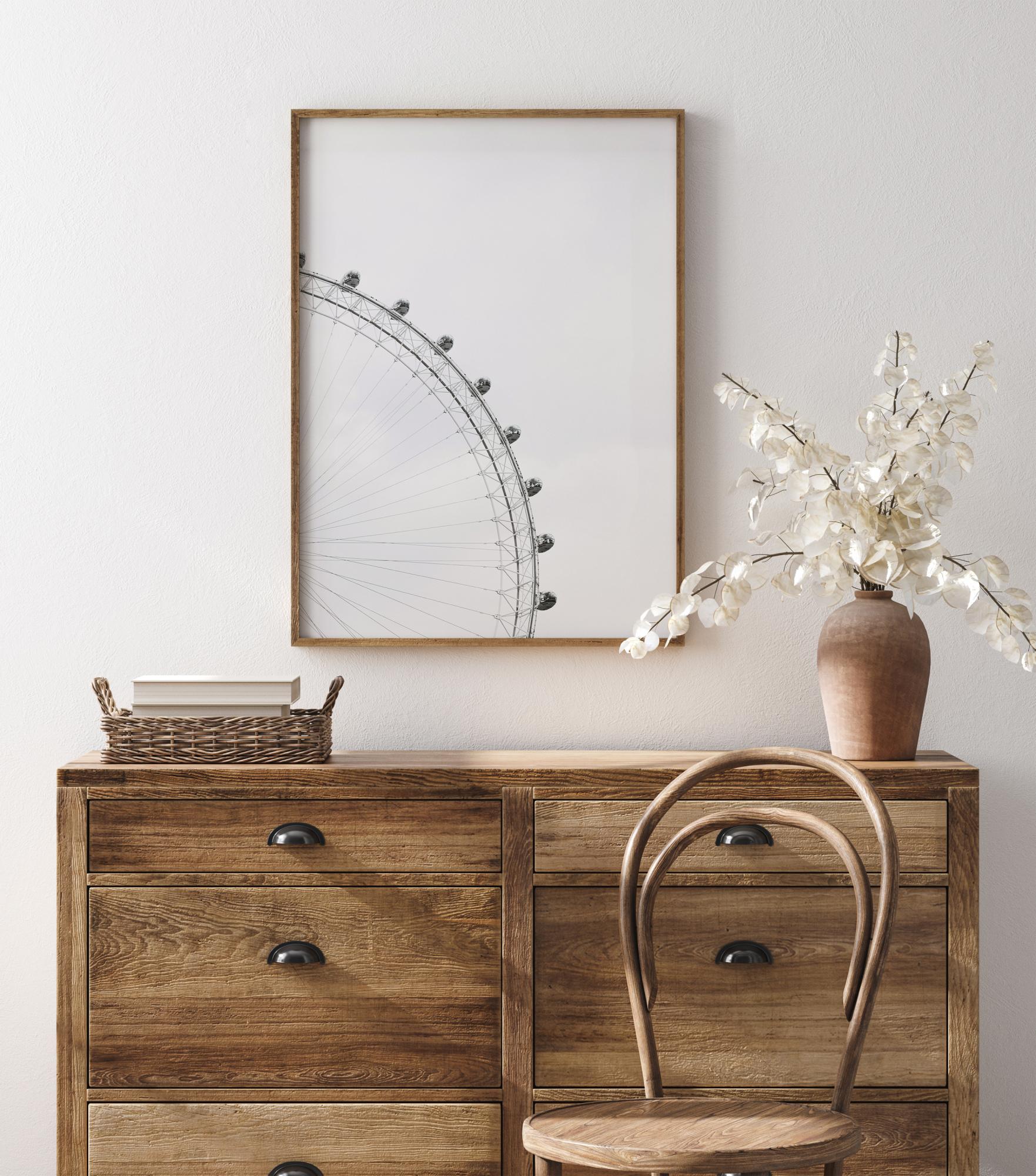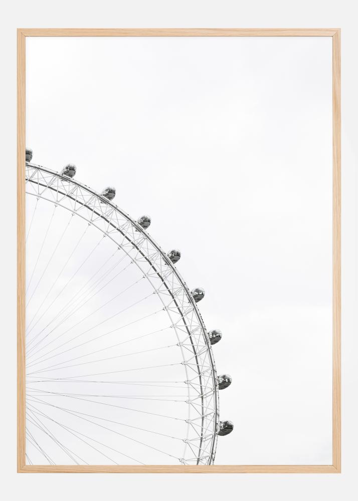 Uma impressionante impressão em preto e branco da London Eye. Com o cinzento do céu de Londres ao fundo, os raios da roda direcionam o olhar para as nove cabines de passageiros. Um póster verdadeiramente impressionante que destaca essa magnífica construção técnica. Imagine a vista de uma dessas cabines.