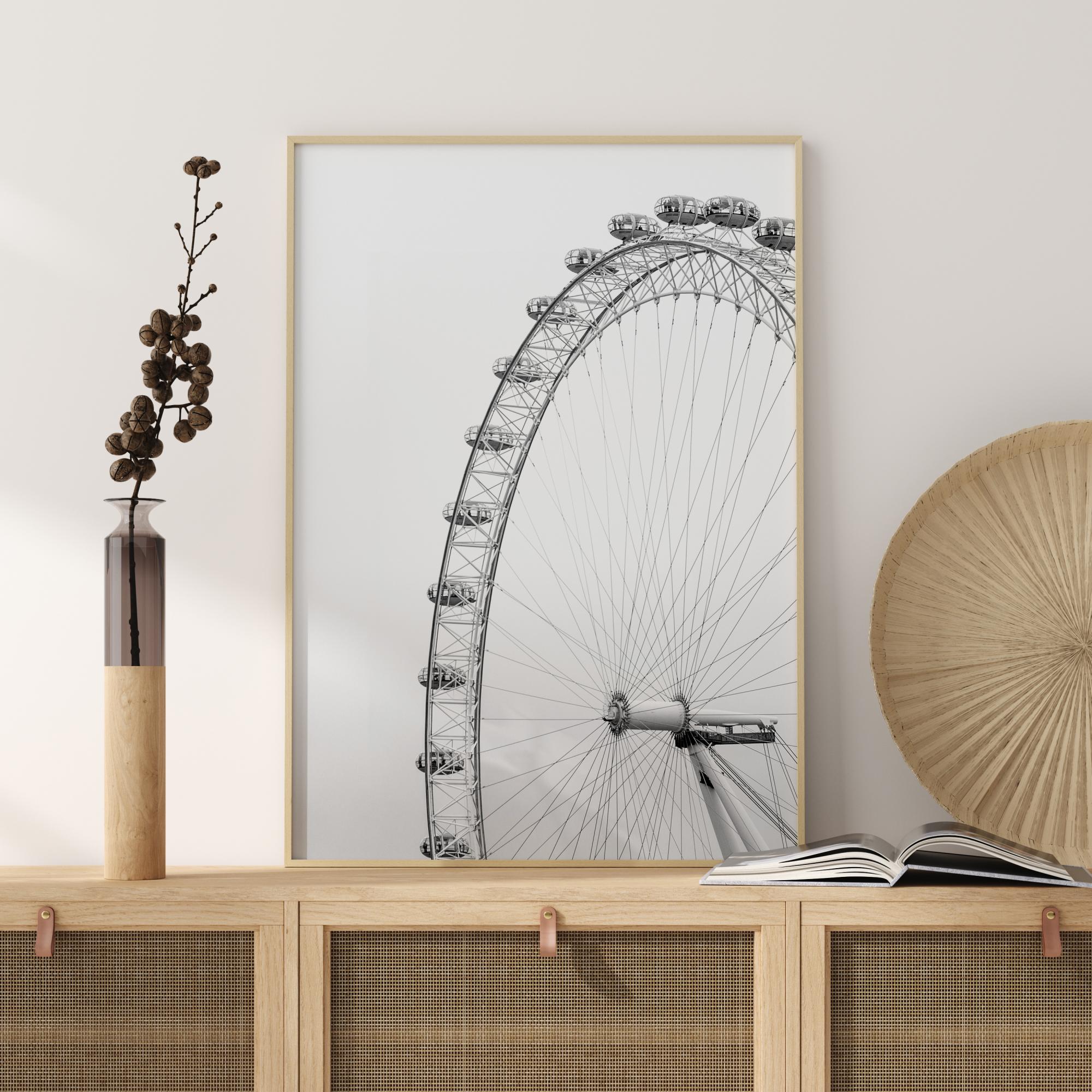 Um póster impressionante com a London Eye. Com o horizonte cinzento, o contorno preto da London Eye direciona o olhar para as cabines de passageiros que estão no topo da roda. Uma impressão fascinante que destaca o tamanho da roda. Uma bela impressão que cria uma sensação de infinitude.