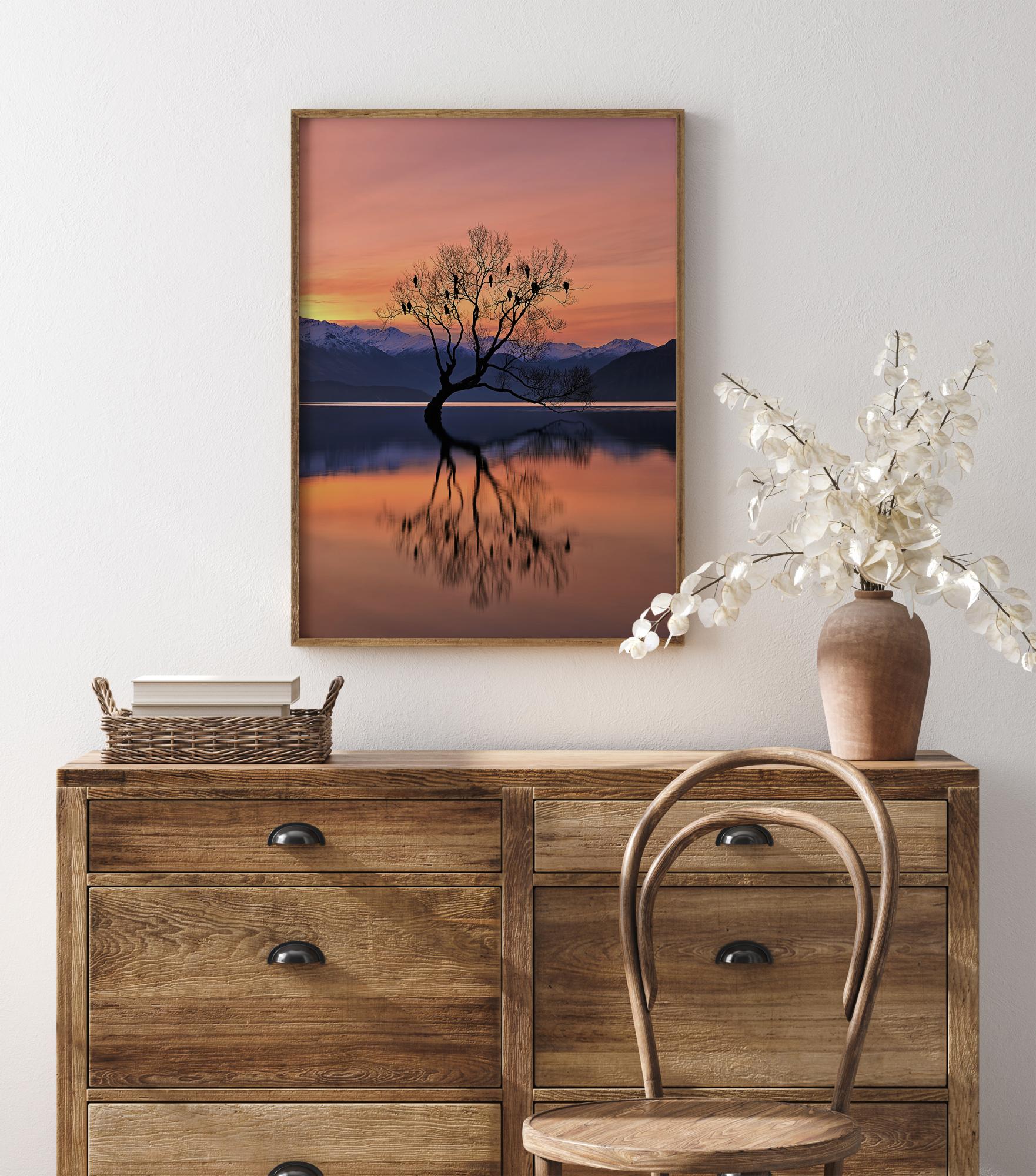 Um belo póster de natureza com uma árvore solitária no meio de um lago. Com pássaros tranquilamente pousados nos galhos, esta impressão em tons pastel reflete a árvore no lago, criando um efeito espelhado perfeito tanto para a natureza quanto para as cores. Ouça o silêncio nesta imagem calmante.