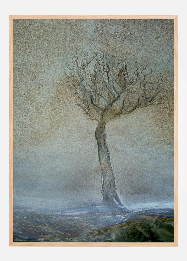 Um póster de paisagem com uma árvore solitária e melancólica. A impressão retrata uma vista panorâmica tenue das planícies com as colinas em primeiro plano. Uma árvore solitária e sem folhas domina a cena. As cores suaves de cinzento e marrom criam uma sensação melancólica e perdida. Pendure esta impressão em um espaço tranquilo.