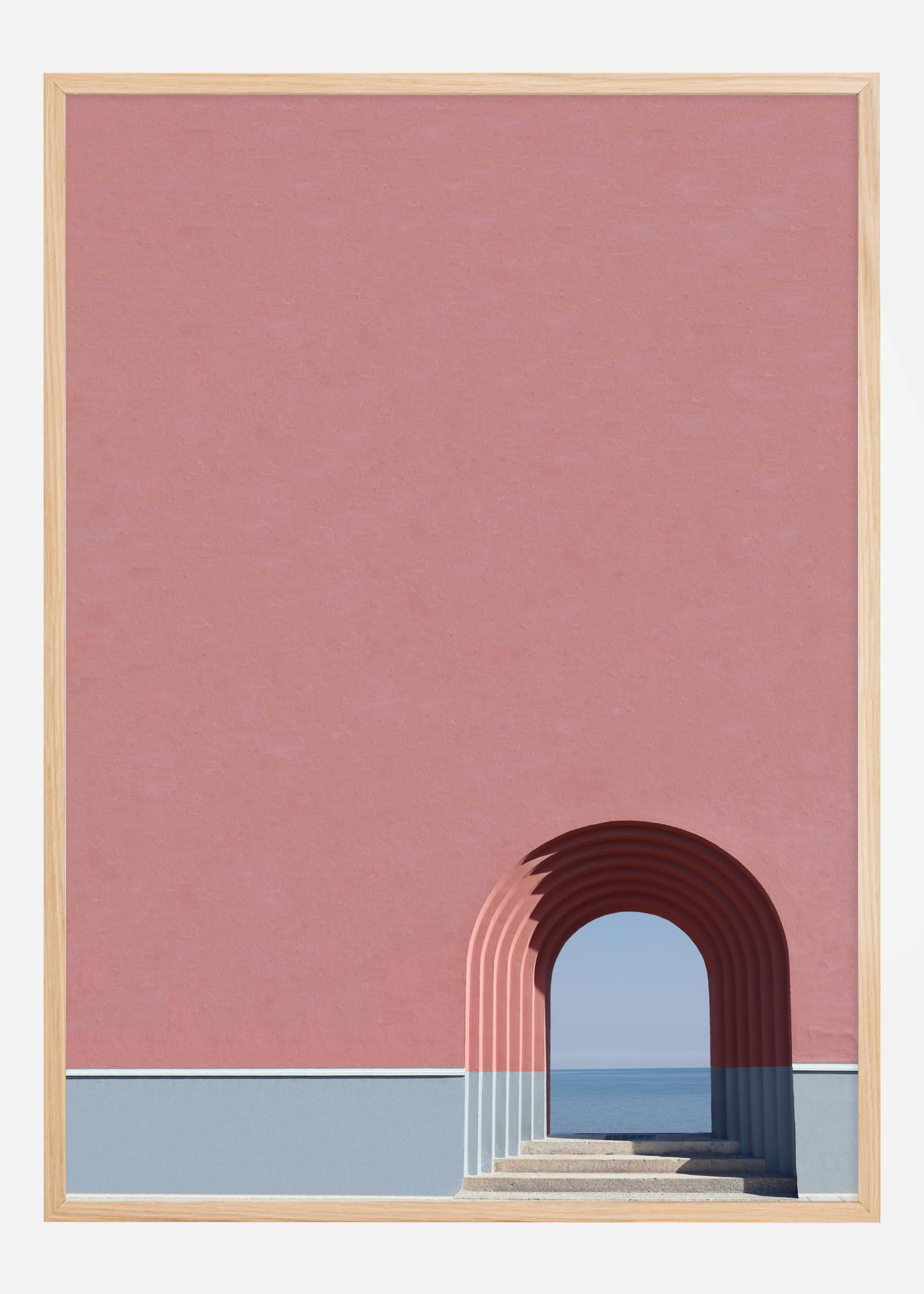 Este pôster intitulado "Olhe o Oceano" convida à contemplação através de seu design simples e limpo. A imagem destaca um arco arquitetônico sereno que se abre para o horizonte infinito do mar. O motivo joga com o contraste entre o suave tom rosa da parede e o tranquilo mar azul, criando uma sensação de calma e harmonia.