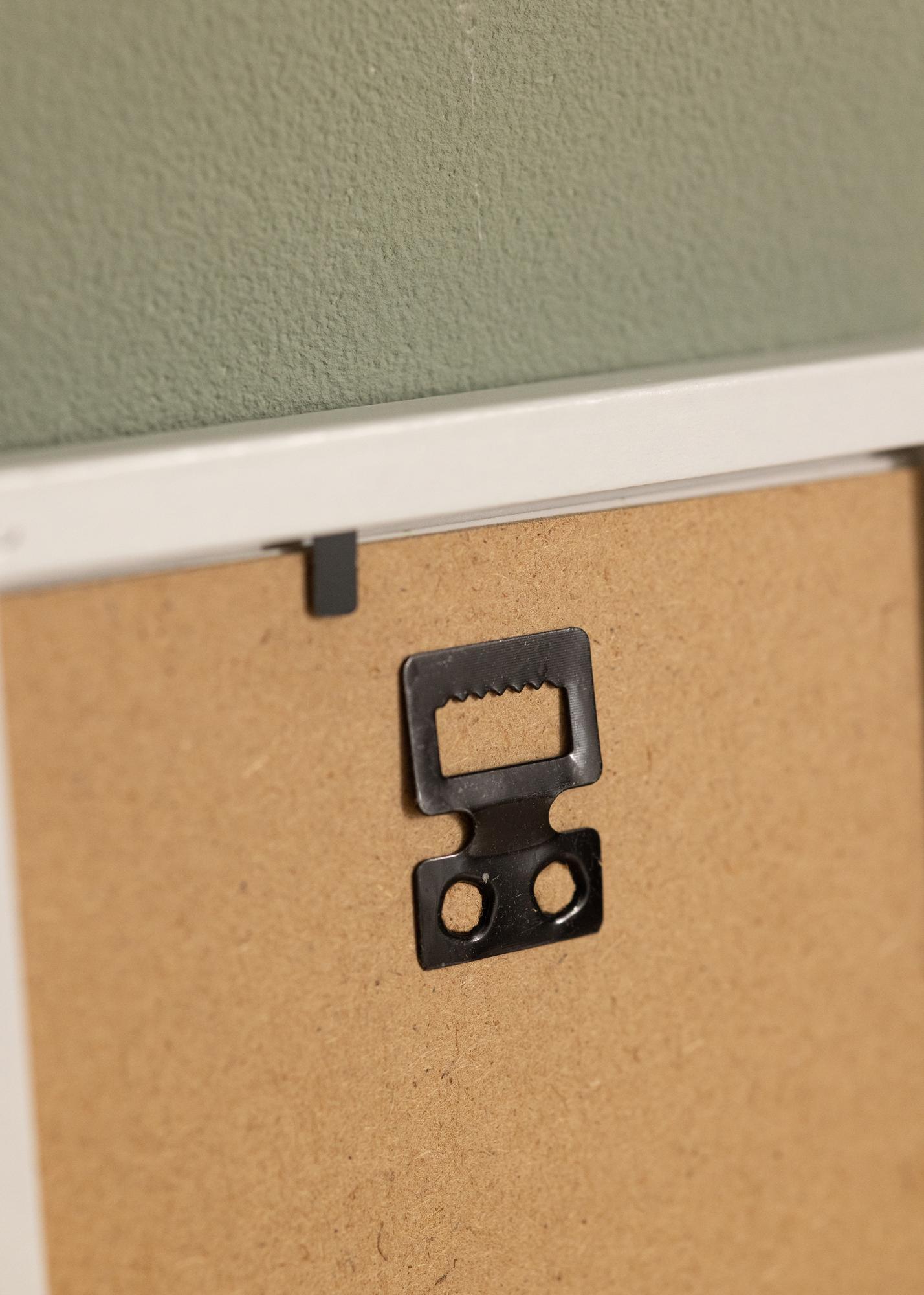A moldura branca comporta duas fotos de 10x15 cm, que são colocadas entre um coração com o texto "Love". Você insere as fotos em cada moldura, soltando primeiro as costas que são mantidas no lugar por pinos dobráveis. A moldura tem suportes de parede na parte de trás e é montada na parede na posição horizontal.